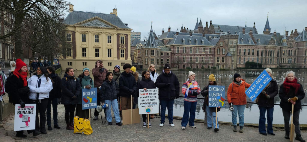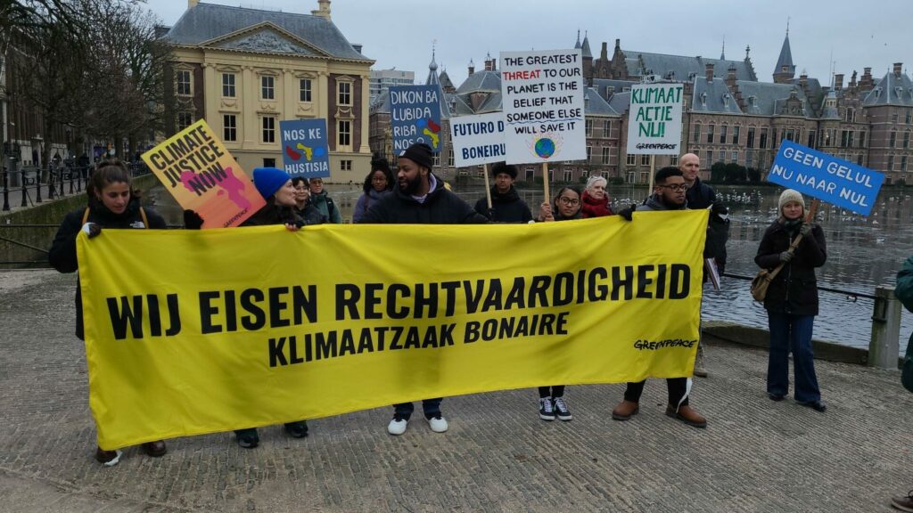 In samenwerking met Greenpeace hebben inwoners van Bonaire de Nederlandse staat aangeklaagd, omdat het eiland onder water dreigt te lopen door de opwarming van de aarde. Ze eisen klimaatrechtvaardigheid: ten eerste moet de regering haar eerlijke aandeel leveren aan het doel van maximaal 1,5 graad opwarming wereldwijd en de CO2-uitstoot sneller terugdringen; ten tweede moet de regering plannen maken om de inwoners van Bonaire te beschermen tegen de gevolgen van klimaatverandering, die nu al gevoeld worden. Deze rechtszaak tegen de staat wordt begeleid door een handtekeningenactie en werd gistermiddag ondersteund met een demonstratie in Den Haag. Daar deden zo’n veertig mensen aan mee, onder wie een aantal inwoners van Bonaire.