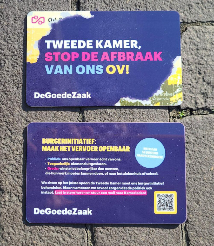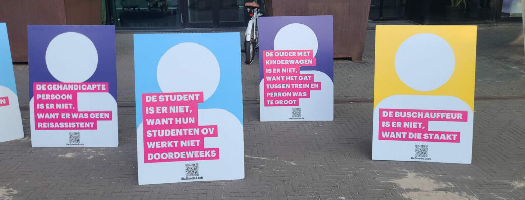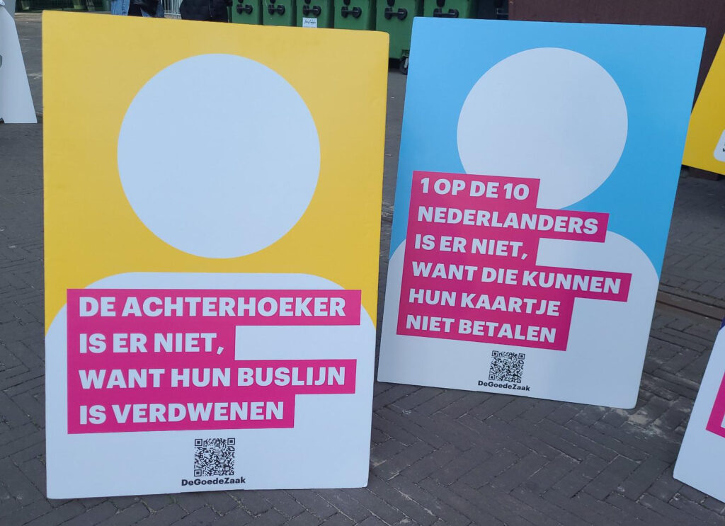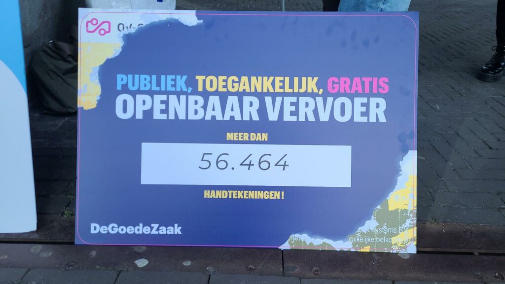 Vanmorgen vanaf 9:00 uur hebben zo’n vijftien mensen bij station Den Haag Centraal actie gevoerd voor een toegankelijk en gratis ov zonder marktwerking. De actie, georganiseerd door DeGoedeZaak (DGZ) en ondersteund door activisten van WijReizenSamen (WRS). werd gehouden in aanloop naar de behandeling van het burgerinitiatief van DGZ in de Tweede Kamer later op de dag. “Al jaren wordt ons openbaar vervoer buslijn voor buslijn gesloopt. Treinen worden drukker, kaartjes duurder en steeds meer regio’s worden onbereikbaar. Je kunt je afvragen of je het openbaar vervoer nog wel openbaar kunt noemen”, aldus DGZ. In de loop van de dag bleek helaas dat het burgerinitiatief werd afgeserveerd door een parlementaire meerderheid.