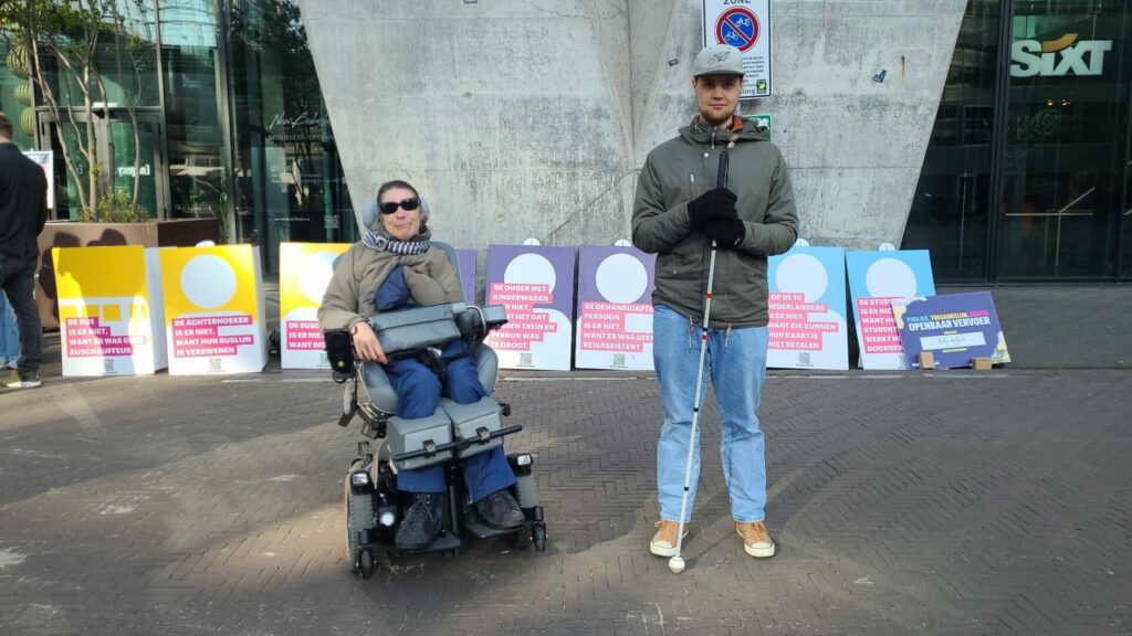 De tekst van een ander actiebord luidde: “De rolstoelgebruiker is er niet, want de lift deed het niet meer”. Een beter ov is namelijk juist ook noodzakelijk voor mensen met een beperking. Dat bleek uit de ervaringen van twee gehandicapte mensen die aan de actie deelnamen. Zij vertelden over de problemen die ze in het ov ondervonden. “We moeten niet doen alsof het thema fysieke toegankelijkheid alleen maar een beperkte groep mensen aangaat”, zei een van hen. “Iedereen kan gehandicapt raken. Als mensen ouder worden, dan neemt de kans op een handicap, een beperking, ook nog eens toe. Een handicap kan bijvoorbeeld al zijn dat je vaak hoofdpijn hebt. Als we het begrip ‘een handicap hebben’ veel breder gaan zien, dan wordt het alleen maar duidelijker dat de toegankelijkheid van het ov sterk moet worden verbeterd. Dat is in het belang van iedereen.”