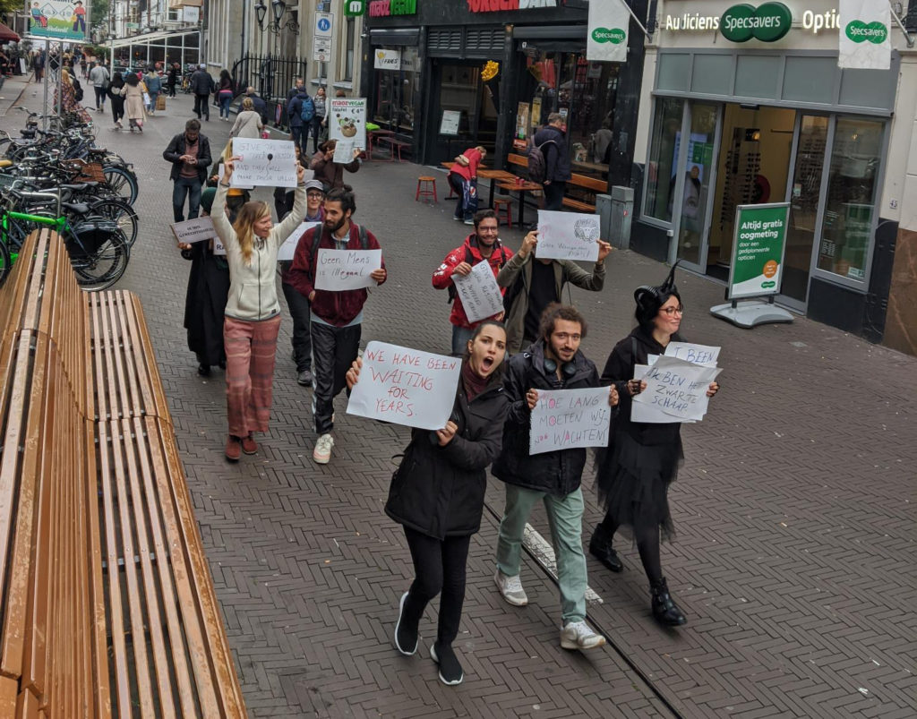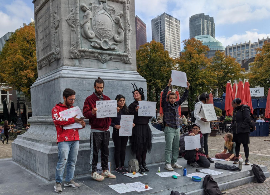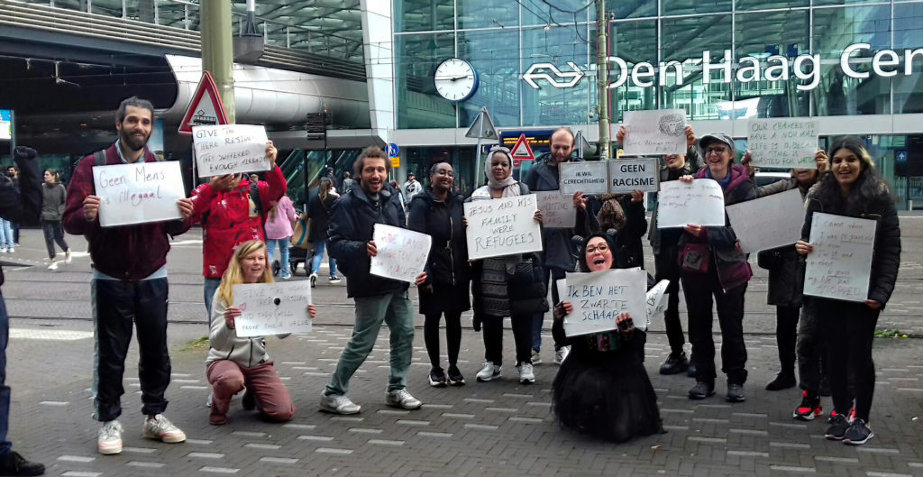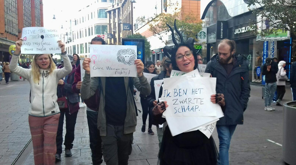 Vanmiddag vond in Den Haag een actie plaats van “Het zwarte schaap”, een collectief van vrouwen zonder verblijfsrecht die afkomstig zijn uit diverse landen. Zo’n 15 mensen, onder wie vrouwen zonder verblijfsrecht en ook wat bondgenoten, stonden met actiebordjes eerst bij het standbeeld van maffiabaas Willem van Oranje op het Plein bij de Tweede Kamer. Later trokken ze het centrum van Den Haag in, om te eindigen bij station Den Haag Centraal.