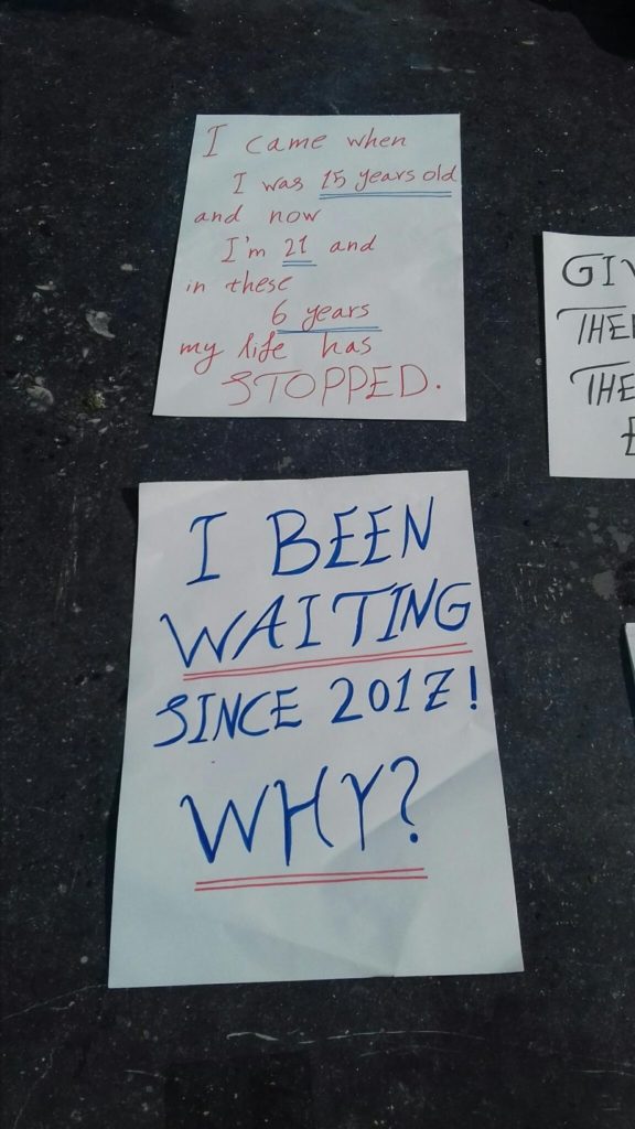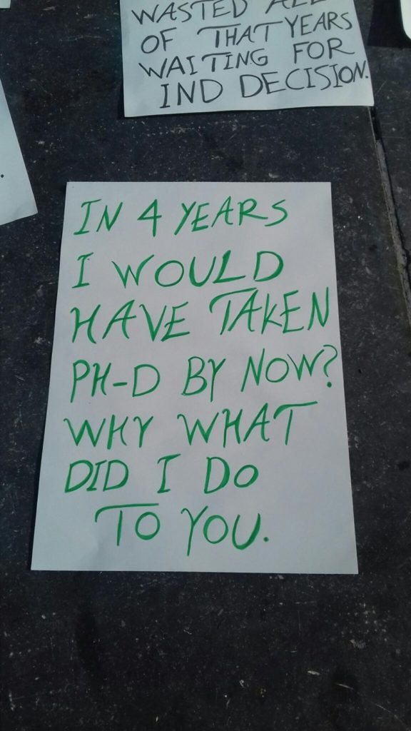 Onder de deelnemers aan de actie bevond zich een vrouw uit Libië. “ik dacht: in Nederland kan ik eindelijk mezelf zijn. Maar mijn dromen zijn kapot gemaakt door de IND. En ik heb de persoon die de beslissing over mijn leven maakte, nooit in de ogen gekeken.” Een man uit Syrië: “Ik wilde niet naar Europa komen, ik had mijn leven daar. Ik bleef eerst steken in Griekenland, maar gelukkig kon ik daar wegkomen. Ik heb geluk gehad. Hier heb ik een verblijfsvergunning gekregen en de Nederlandse nationaliteit. Maar Nederland zou meer mensen moeten helpen.”