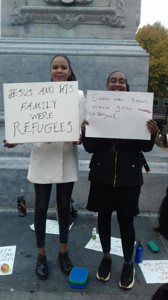 Naast vrouwelijke vluchtelingen waren er ook vrouwelijke migranten, zoals iemand uit Suriname. “Ik ben geboren voor de onafhankelijkheid van Suriname in 1975. Ik was vroeger daarom Nederlander. Later kwam ik naar Nederland. Ik kon hier een leven opbouwen. Ik kreeg een verblijfsvergunning. Maar toen mijn man overleed, werd die verblijfsvergunning van me afgepakt. Ik werd dus illegaal. Als Nederlander geboren, nu illegaal.” Een vrouw uit Iran: “Ik wacht al zes jaar in een azc. Hoe lang moet ik nog wachten? Mijn leven staat al zes jaar stil.” Verder deden er ook nog Soedanese vluchtelingen aan de actie mee.