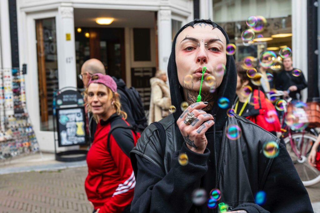 “Wij zijn hier vandaag, opnieuw, om te laten zien dat wij ons niet uit deze stad – waar het kapitalisme regeert – laten wegjagen”, zo begon Pim zijn praatje. “Elke stad heeft een vrijplaats nodig: een verzamelpand voor sociaal-culturele initiatieven die draaien op zelfbestuur en wederzijdse hulp, waar mensen terecht kunnen bij de weggeefwinkel, waar ruimte is voor spreekuren en vergaderingen, waar je van een betaalbare veganistische maaltijd kunt genieten, waar jong en oud elkaar ontmoeten en culturele evenementen, zoals exposities en concerten, zonder winstoogmerk worden georganiseerd. Kortom, een plek waar het niet draait om de poen, maar om het samen dingen doen!