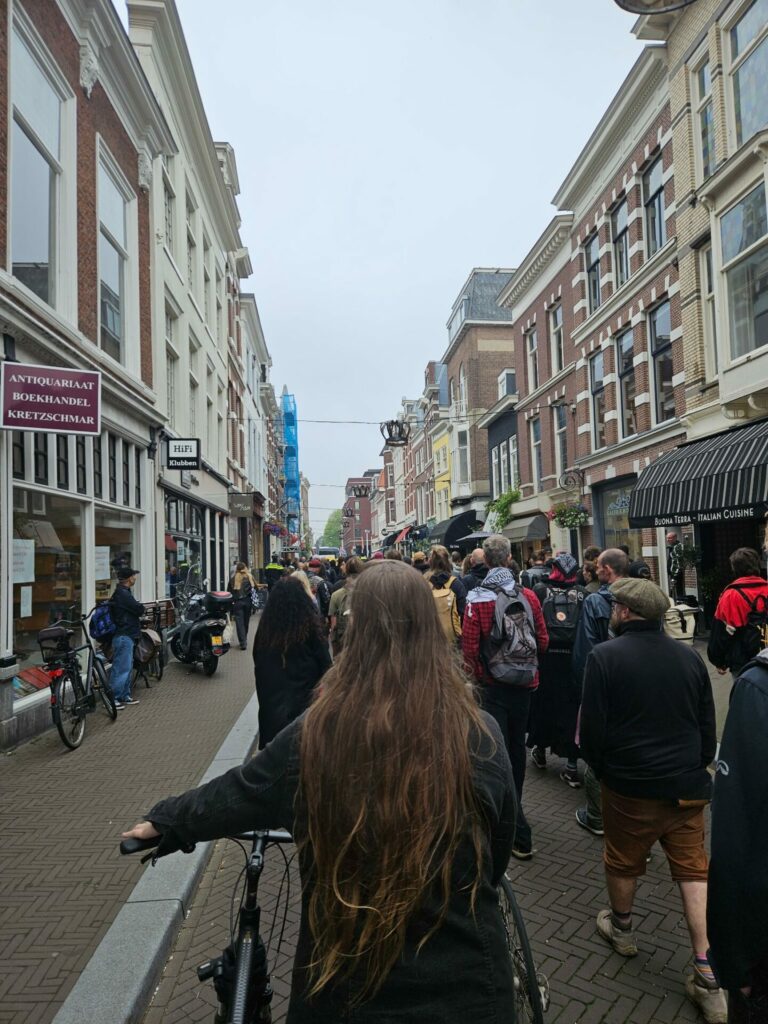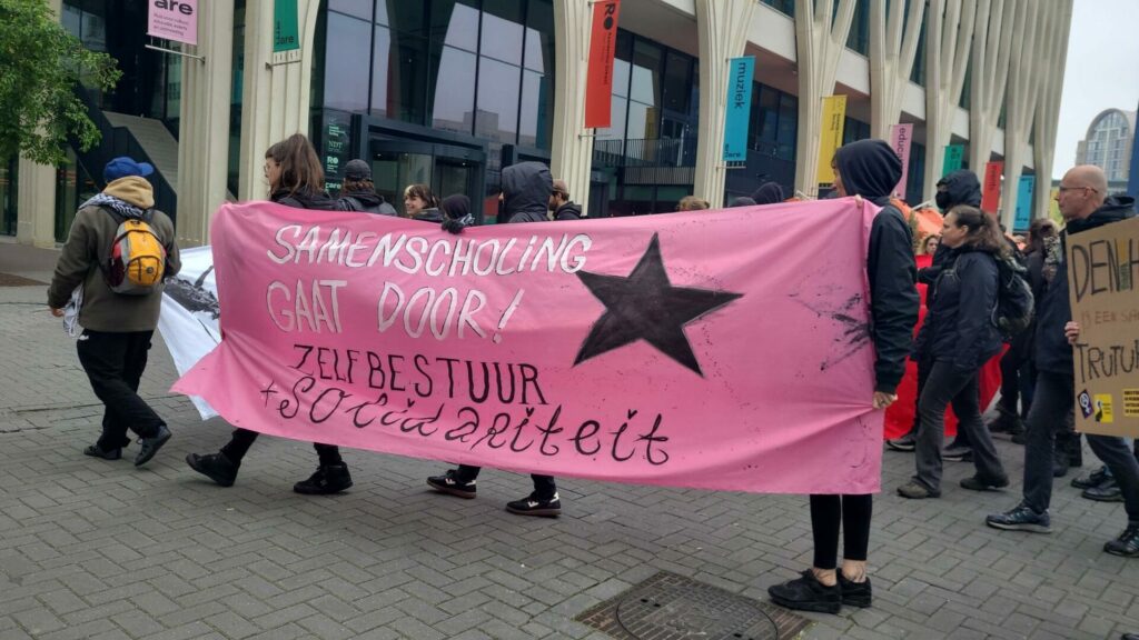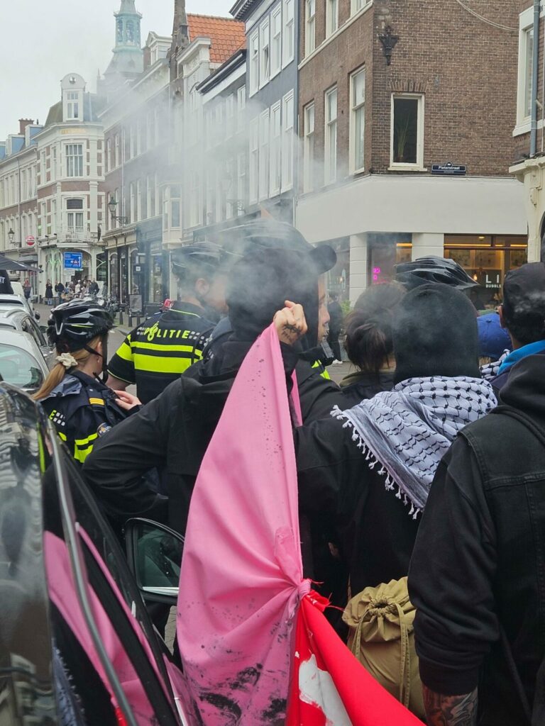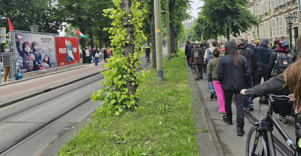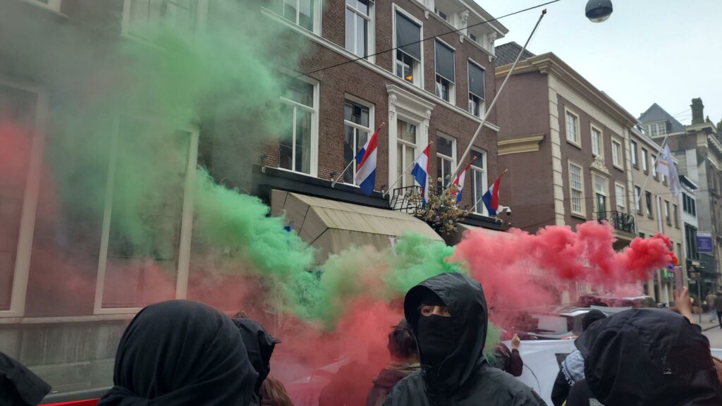 De demonstratie begon op het Spuiplein, met een energieke toespraak van Pim (zie hieronder), die actief is in de Bond Precaire Woonvormen (BPW). De tocht voerde onder meer langs het voormalige kraakpand de Illusie en werd begeleid door muziek, spandoeken en leuzen als “A-, anti-, anti-capitalista”, “Geen bazen en politici, maar zelfbestuur en anarchie”, “Free, free Palestine”, “Change your diet for the climate, eat the rich” en “Daar staat een pandje leeg”. Dat kraken in Den Haag doorgaat, bleek enige tijd geleden nog, toen tijdens de Europese “Housing Action Days” een al jarenlang leegstaande dönerzaak met bovenwoningen aan het Spui in gebruik kon worden genomen. Maar door het gewelddadige optreden van de eigenaar ging het pand alweer snel verloren voor de Haagse kraakbeweging.