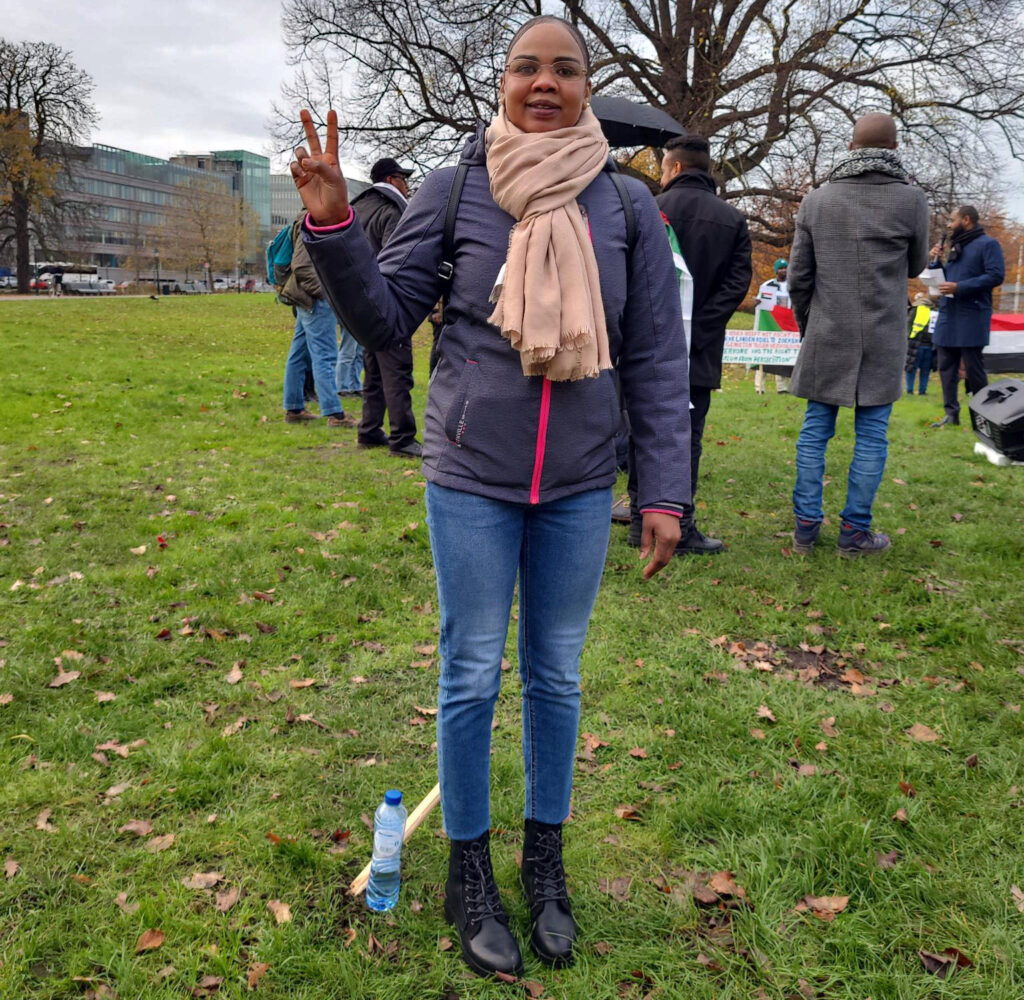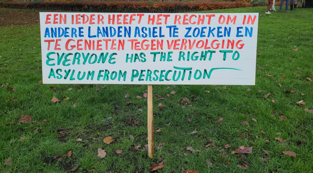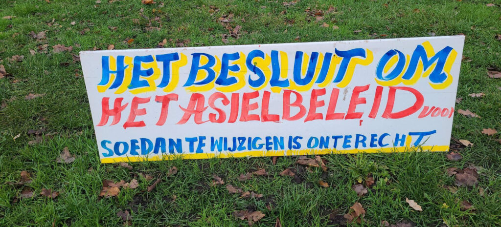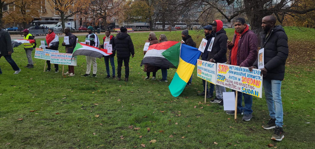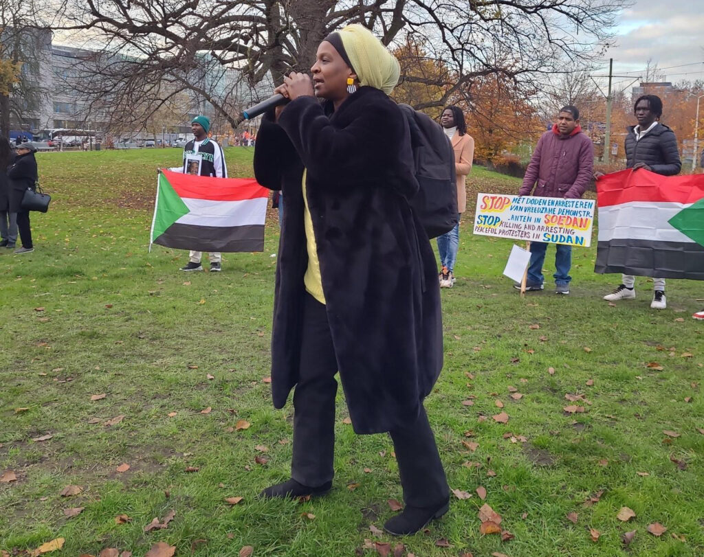 We staan in de buurt van het ministerie van Justitie, met Soedanezen die zijn gevlucht voor de militaire dictatuur in Soedan. Eerst was dat lange tijd het militaire regime van de inmiddels afgetreden dictator Omar al-Bashir. Sinds oktober 2021, na een militaire staatsgreep, is dat het regime van Abdel Fattah al-Burhan. Soedanese vluchtelingen moeten vrezen voor opsluiting, marteling en zelfs de dood, als ze zouden worden gedeporteerd naar Soedan, waar de militairen nog steeds aan de macht zijn. We willen hier duidelijk maken dat de IND afschuwelijk omgaat met vluchtelingen uit Soedan. Velen krijgen geen verblijfsrecht en dus geen veiligheid en geen bestaanszekerheid.