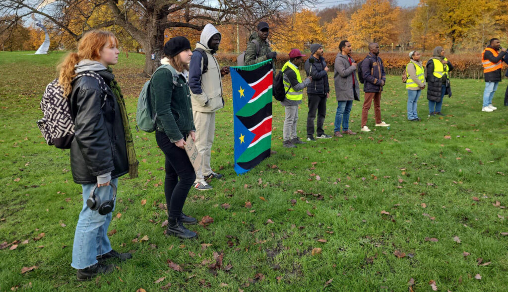 Soedanese en andere vluchtelingen voeren een zware strijd. Strijd tegen de politiek van migratiebeheersing. Strijd voor een beter leven, voor een betere toekomst. Voor vluchtelingen zonder papieren is het 24 uur per dag strijd. Strijd om te overleven, op straat, zonder geld, zonder eten. Het is belangrijk en uiterst noodzakelijk om die strijd te steunen. Dat kunnen we doen door individuele hulp aan vluchtelingen en door collectieve strijd met vluchtelingen. Bijvoorbeeld door strijd zoals we hier staan, in de buurt van het ministerie van Justitie. Laten we daarom met z’n allen die strijd blijven voortzetten, elke dag, elk uur. Want geen mens is illegaal en de wereld is van iedereen.