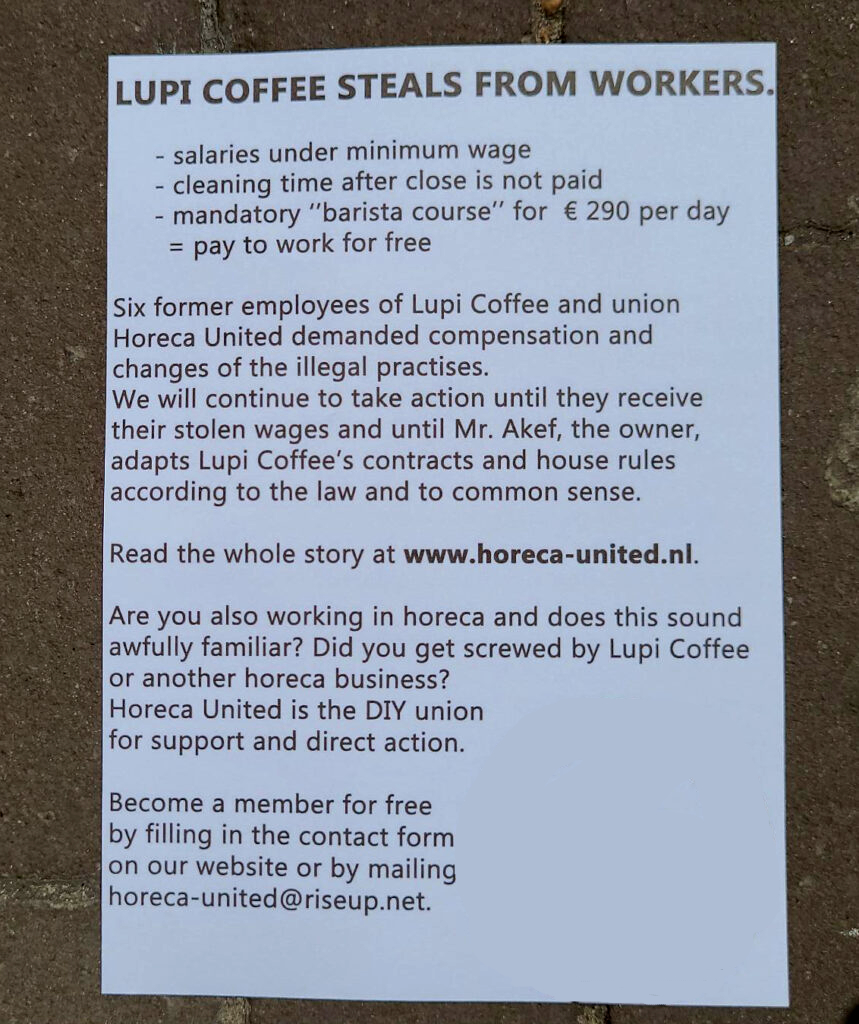 Samen met de vakbond van onderop Horeca United eisen zes voormalige barista’s van Lupi Coffee, een soort wannabe-Starbucks, dat het horecabedrijf achterstallig loon uitbetaalt en stopt met uitbuiting van het personeel. Nadat het bedrijf niet reageerde op een ultimatumbrief van de ex-werknemers, werd het tijd voor het opvoeren van de druk via flyeracties. In reactie daarop ging de eigenaar van de keten, Hossein Akef, over tot een smerige intimidatiepoging. Maar de campagne gaat door totdat Lupi Coffee de eisen heeft ingewilligd.