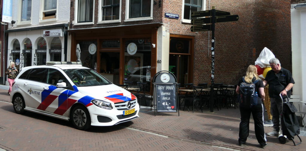 Behalve wijzelf dan, aan het begin van de actie. Er waren geen klanten aanwezig, maar wel een leidinggevende die vreselijk opgefokt begon te roepen dat we naar buiten moesten en geen foto’s mochten maken (“dan schend je mijn beeldrecht!!”). Ze belde meteen de politie. Na een minuut of twintig arriveerden twee agenten die de ID van onze woordvoerder eisten en zeiden dat we moesten vertrekken. Er ontstond enige discussie. Agent: “Jullie plegen laster en smaad”. Woordvoerder: “Nee hoor, we brengen informatie naar buiten, dat is onze vrijheid van meningsuiting”. “Het is schadelijk, want het is gericht tegen dit bedrijf.” “Ja, en?” “Dat mag niet.” “Ja, mag wel, hoor”. “Maar dat mag je niet voor de deur doen.” “Echt wel, je mag juist actievoeren bij de plek waar de misstand plaatsvindt.” Daarop zeiden de agenten: “We gaan eerst naar binnen en gaan jullie dan wegsturen.” De woordvoerder reageerde: “Dat kan, maar dan haal je je wel problemen op de hals, want het is volkomen legaal wat we doen”. De agenten leken even van hun stuk gebracht, en gingen vervolgens naar binnen. Na lange tijd in het café met de leidinggevende gesproken te hebben, terwijl wij doodleuk bleven flyeren, kwamen ze naar buiten en vorderen ze ons om vijftig meter verderop te gaan staan. Daar hebben we toen onze actie voortgezet.