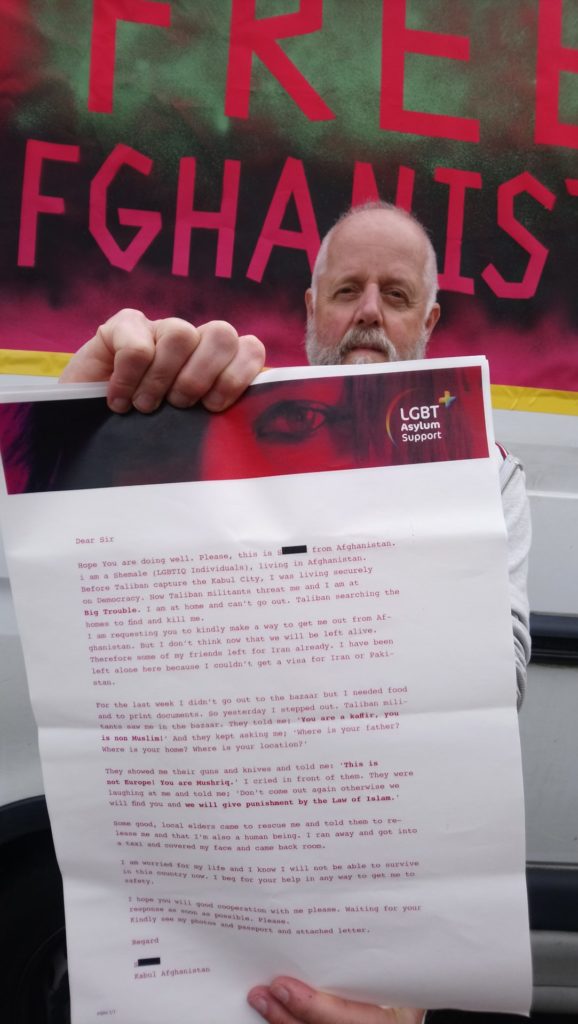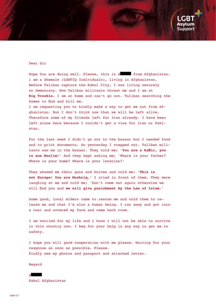‘De Taliban doorzoekt huizen om mij te vinden en te doden. Help mij om uit Afghanistan te kunnen vluchten.’ Met deze noodkreet heeft onlangs een transgender persoon vanuit Afghanistan de hulp van LGBT Asylum Support ingeroepen. Vanuit een zeer snel veranderende en vijandige situatie, smeekt zij om hulp om haar land te kunnen ontvluchten. Ze is alleen achtergebleven nadat vrienden wel een visum konden krijgen voor Iran maar zij niet. Op straat is ze door Taliban militie aangesproken als ongelovige en bedreigd met geweren en messen en dat ze gestraft zal worden volgens de wet van de islam. ‘Dit is niet Europa! Jij bent Mushriq (afvallige)’, werd haar verteld. ‘Kom niet meer naar buiten, anders vinden we je en zullen we je straffen volgens de wet van de islam.’