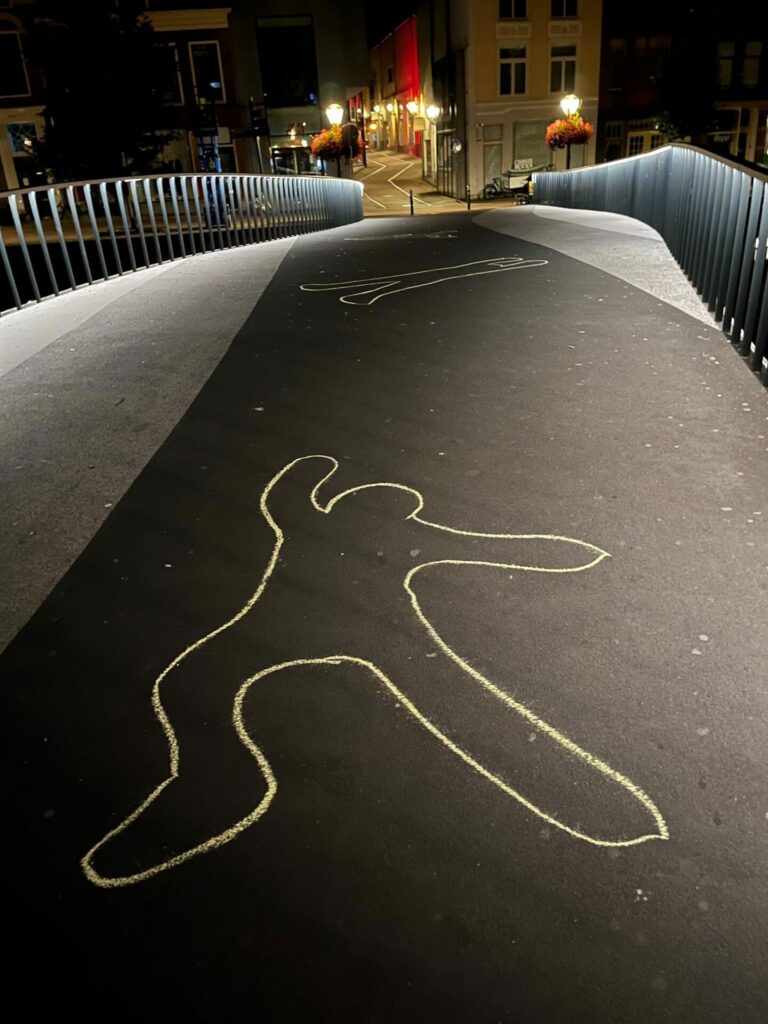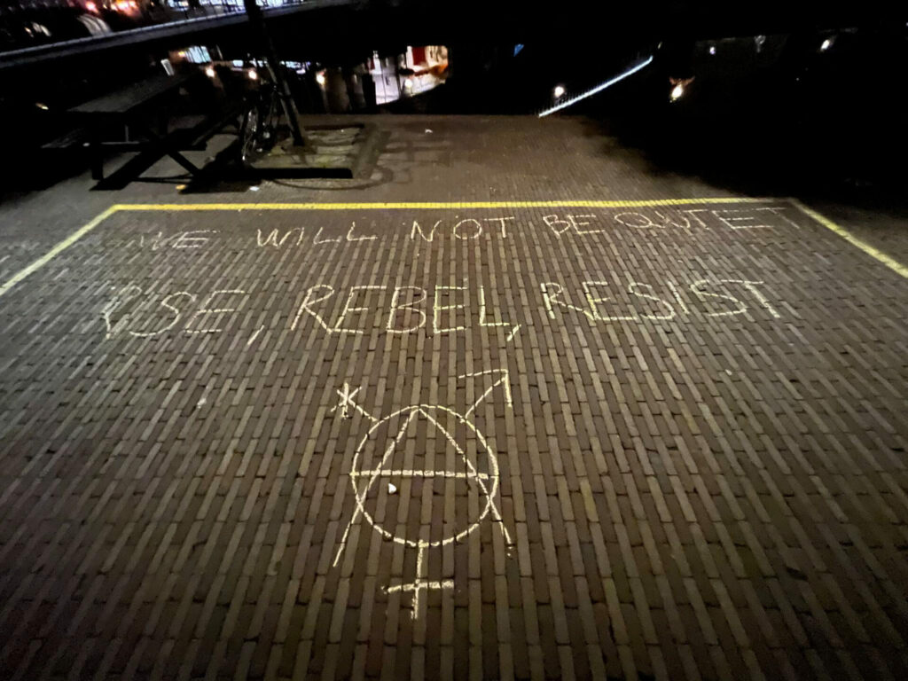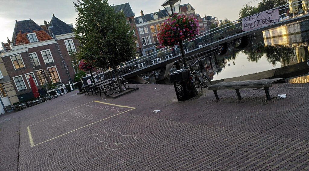Naar aanleiding van het politiegeweld afgelopen zaterdag tegen queer-activisten die een spandoek aan een brug wilden ophangen tijdens de Leidse Canal Pride, schreef de organisatie Queer Pride March Leiden, waaraan ook enkele Doorbraak-activisten deelnemen, deze verklaring. Vannacht hebben queer-activisten alsnog een spandoek opgehangen aan die brug én gekrijt in het ‘vak’ waar zaterdag een groep lhbtqia+ers en bondgenoten twee uur lang gegijzeld werden door de politie.