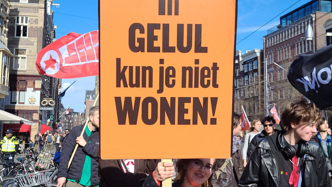Afgelopen zondag deden zo’n 150 mensen mee aan een energiek woonprotest in het centrum van Amsterdam. De actie had de vorm van een city sightseeing tour die op allerlei plekken in de stad onder de aandacht bracht hoe diep de wooncrisis ingrijpt in het leven van zoveel Amsterdammers. Veel woonstrijd- en andere belangengroepen namen deel aan het protest, en ook