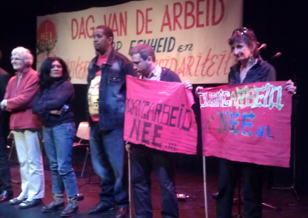Uit Leiden kwam wel heel mooi nieuws. Daar is Doorbraak al tijden actief met een campagne tegen dwangarbeid, de correcte benaming voor het verplicht en onbetaald verrichten van arbeid door mensen in de bijstand. In dat kader voerde Doorbraak ook actie op de stoep van het zogeheten Participatiecentrum, waar deze dwangarbeid dus plaatsvindt. Vijfentwintig mensen, vooral van Doorbraak zelf, namen deel. De inzet was om met de daar werkende mensen in contact te komen. Kennelijk vond de directie dat geen goed plan, want de mensen kregen een vrije dag! Dus wordt er in Leiden niet alleen 1 mei gevierd, maar ook 2 mei, in de vorm van een soortgelijke actie. Die bracht weer 25 mensen op straat: 10 Doorbrakers, 15 dwangarbeiders met wie dus contact was, “en daar was het ons om te doen!”. Geen vrije dag, maar wel een beoogd effect van de actie dus. Maar met dit type van actie wordt in ieder geval de strijdbare kern van de 1 mei traditie levend gehouden en geactualiseerd. Dat smaakt naar meer, over een jaar en in de krap twaalf maanden die daaraan vooraf gaan.