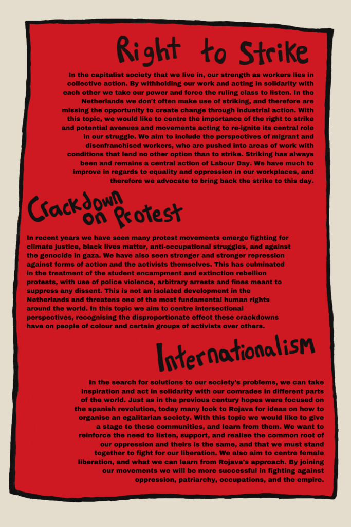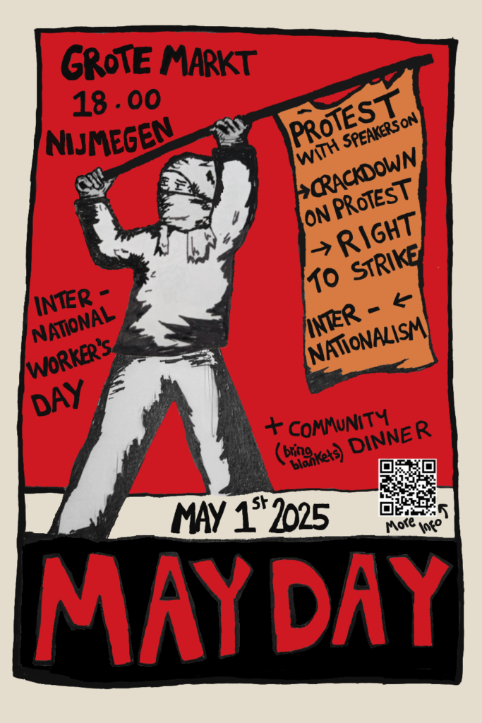 “Join us to celebrate the International Day of Workers, May Day! We will be having a demonstration in Nijmegen, with speakers on the right to strike, crackdown on protests, and internationalism”, we read on the Grote Broek website.