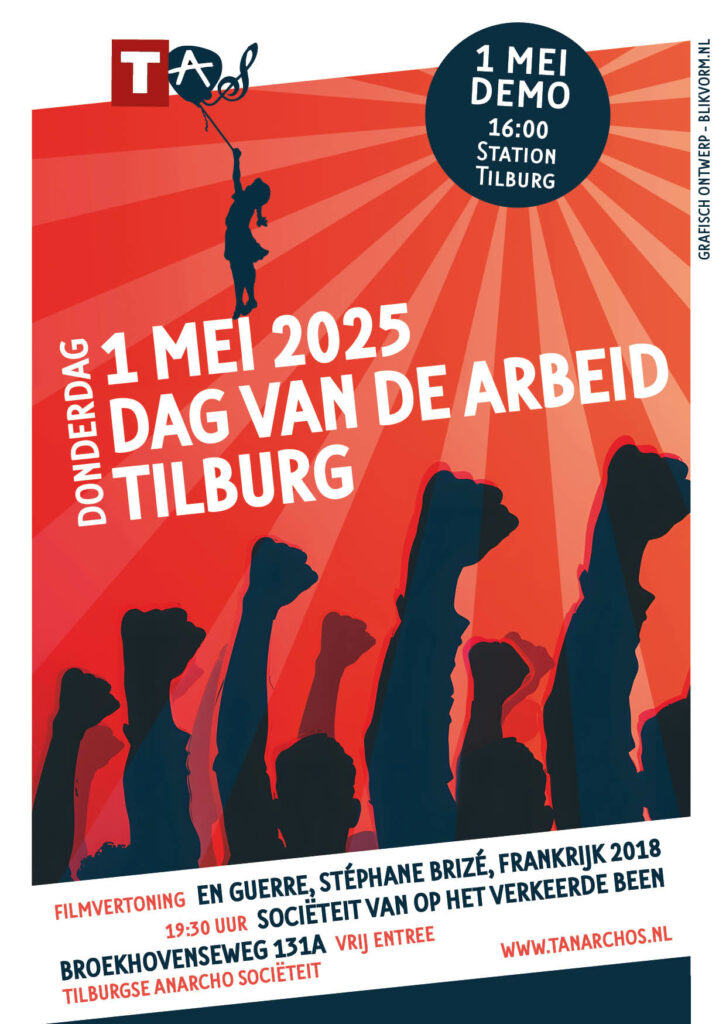 We verzamelen bij het station centrumzijde / Spoorlaan, en na enkele korte toespraken lopen we in demonstratieve optocht door de binnenstad. Rond 17:15 uur zijn we dan weer bij het station, waar we met nog een enkel woord de demonstratie afsluiten. We wijzen graag ook op de 1 Mei viering van de Tilburgse Anarcho Societeit (TAS): een filmvoorstelling ‘s avonds. Daar kunnen we dus na afloop van de demonstratie heen.”