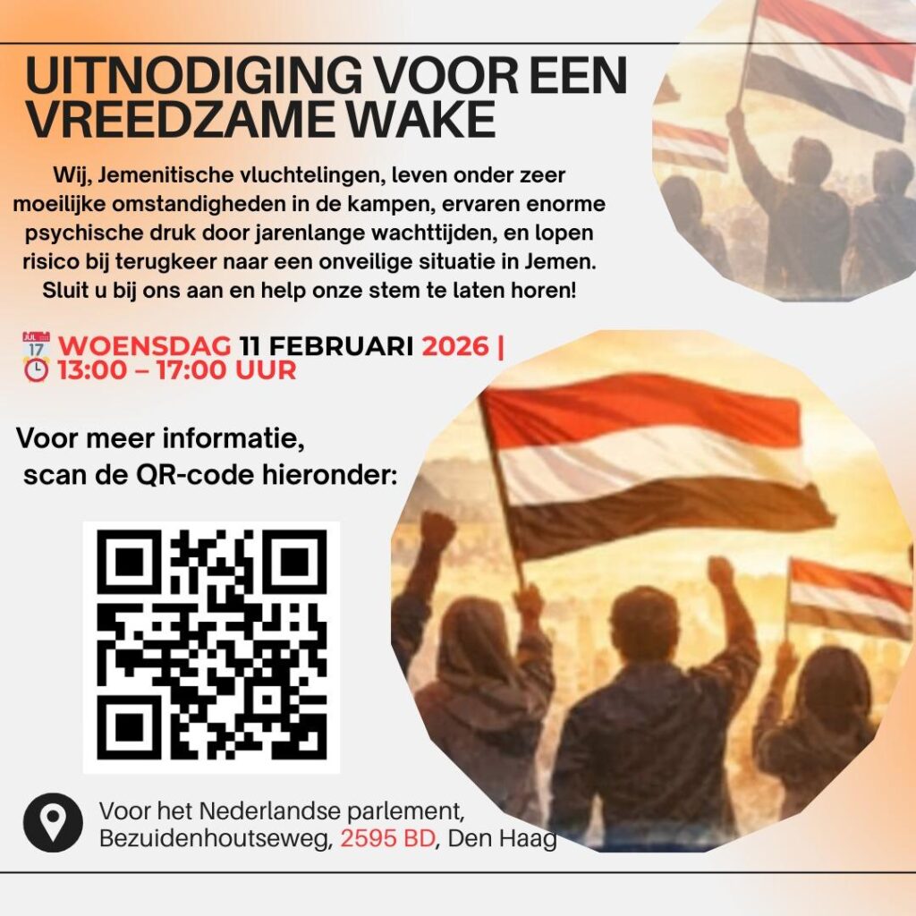 “Jemenitische vluchtelingen in Nederland roepen op tot gerechtigheid te midden van een vergeten oorlog”, aldus het begin van de oproeptekst voor een protestactie van vluchtelingen uit Jemen. “Op woensdag 11 februari 2026, van 13.00 tot 17.00 uur, zullen Jemenitische vluchtelingen en sympathisanten zich verzamelen voor de Tweede Kamer aan de Bezuidenhoutseweg in Den Haag voor een vreedzaam protest. Deze wake heeft tot doel om de aandacht te vestigen op de erbarmelijke situatie van Jemenitische vluchtelingen in Nederland en om Nederlandse beleidsmakers eraan te herinneren dat Jemen nog steeds zeer onveilig is. Het protest is een oproep tot waardigheid, gerechtigheid en eerlijke asielprocedures voor mensen die zijn gevlucht voor oorlog, vervolging en de ineenstorting van hun land.”