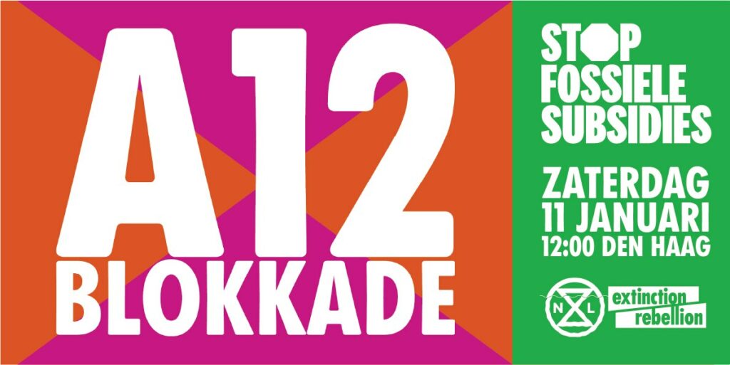 Uit de oproeptekst: “Het afgelopen jaar is het warmste jaar op aarde sinds het begin van de metingen. En toch krijgen de veroorzakers van de klimaat- en ecologische crisis jaarlijks nog miljarden aan subsidies! Op zaterdag 11 januari om 12:00 uur is hét moment om te laten zien dat dit onacceptabel is! Dan gaan we weer samen de A12 op om een direct einde te eisen aan de fossiele subsidies. En we breiden onze acties uit naar een aantal andere strategische punten in Den Haag. Er liggen stapels rapporten en adviezen, de tijd van praten is voorbij! Kom ook in actie en meld je aan!