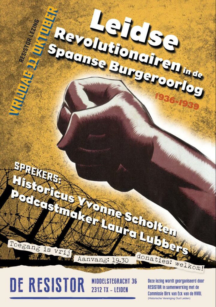 “Historicus Yvonne Scholten zal vertellen over de burgeroorlog, de Internationale Brigades en haar Leidse leden. Laura Lubbers zal vertellen over haar podcast-serie “De Spanjestrijders en Ik”, waarin ze mede op zoek gaat naar de drijfveren van wereldverbeteraars vandaag de dag”, zo begint de aankondiging van de avond die georganiseerd wordt door de commissie Dirk van Eck in samenwerking met Resistor.