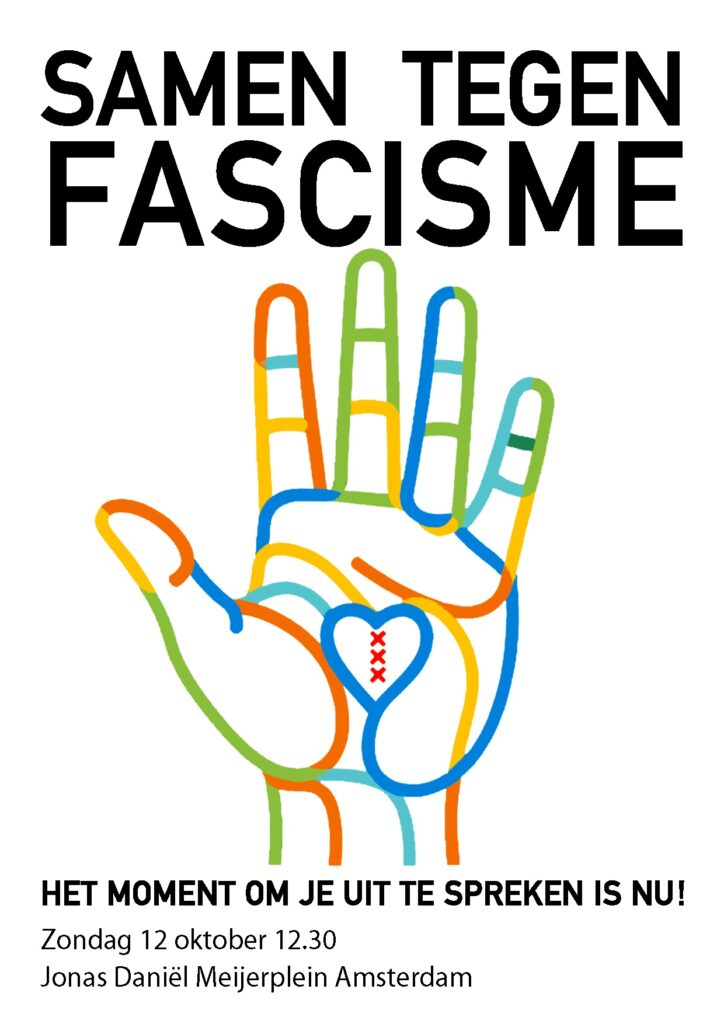 Kom op 12 oktober om 12:30 uur naar het Jonas Daniel Meijerplein en doe mee aan deze manifestatie tegen fascisme, om zo de haat die op dat moment wordt uitgedragen op de Dam een oorverdovend weerwoord te geven. Samen staan we sterk. Dus roep je buren, vrienden, familie, schaakclub, het lokale buurthuis en collega’s bij elkaar, kom en doe mee!