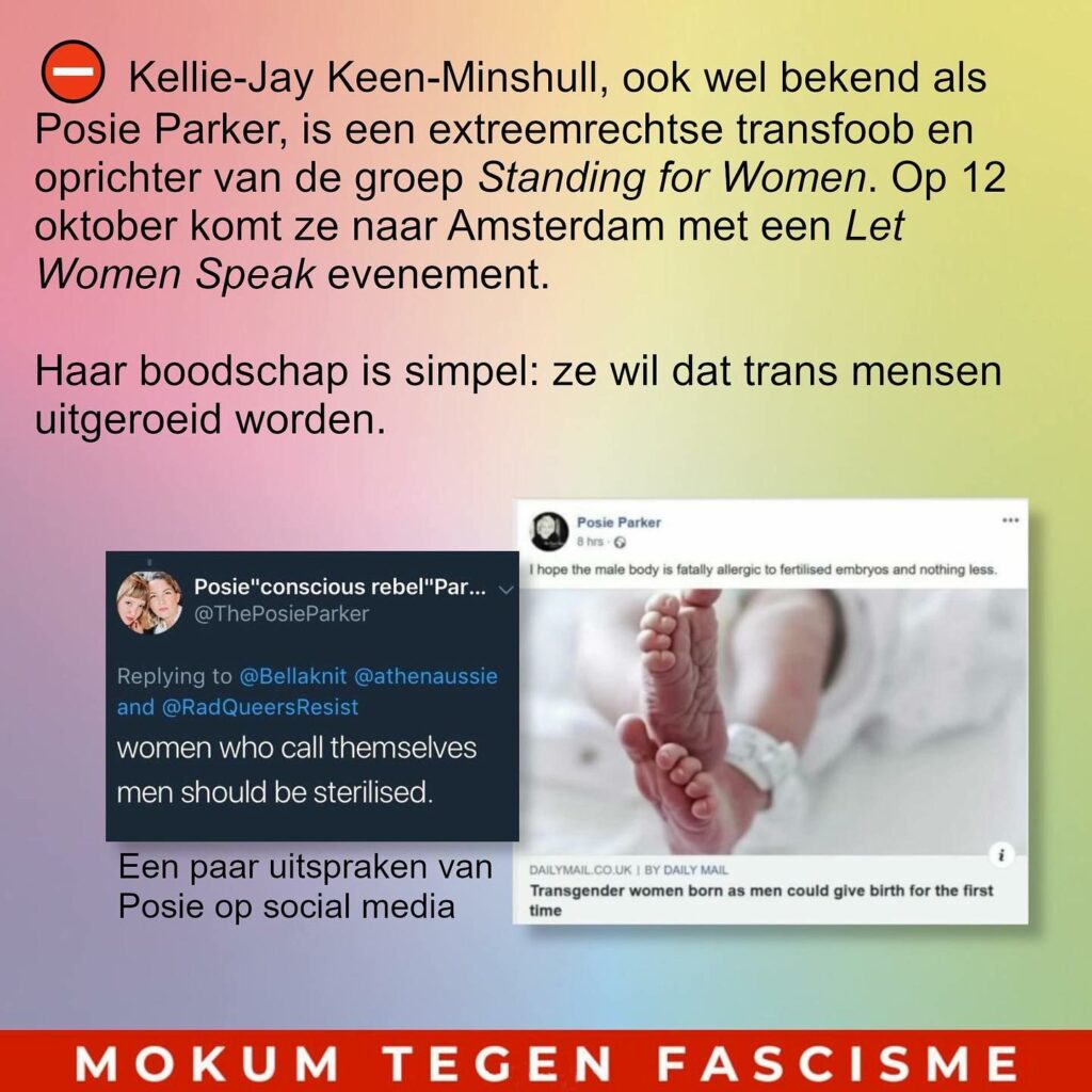 Uit de oproeptekst: “Kellie-Jay Keen-Minshull, ook wel bekend als Posie Parker, is een extreem-rechtse transfoob en oprichter van de groep Standing for Women. Op 12 oktober komt ze naar Amsterdam met een Let Women Speak-evenement. Haar boodschap is simpel: ze wil dat trans mensen worden uitgeroeid.