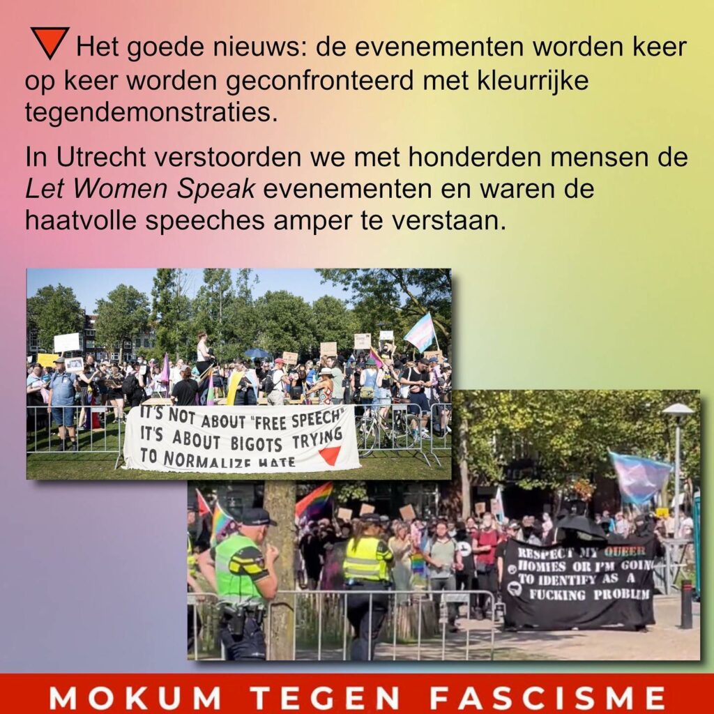 Het goede nieuws: de evenementen worden keer op keer geconfronteerd met kleurrijke tegendemonstraties. In Utrecht verstoorden we met honderden mensen de Let Women Speak-evenementen en waren de haatvolle speeches amper te verstaan.