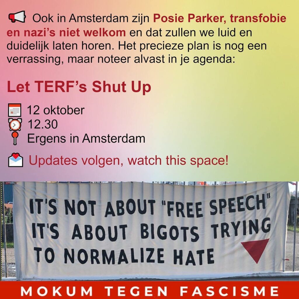 Vanuit de queer- en anti-fascistische beweging wordt er op 12 oktober opnieuw een Let terfs shut up-actie tegen transhaat georganiseerd. Deze keer richt het protest zich tegen een Let Women Speak-evenement in Amsterdam. Eerder vonden er in Utrecht al protestacties tegen transhaatbijeenkomsten plaats op 9 september en 18 november 2023 en op 26 mei 2024.