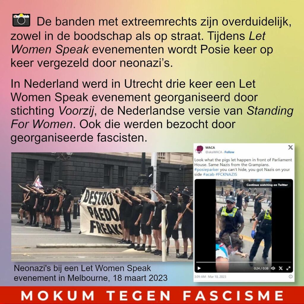 De banden met extreem-rechts zijn duidelijk, zowel in de boodschap als op straat. Tijdens Let Women Speak-evenementen wordt Posie herhaaldelijk vergezeld door neo-nazi’s. In Nederland werd in Utrecht drie keer een Let Women Speak-evenement georganiseerd door stichting Voorzij, de Nederlandse versie van Standing For Women. Ook die werden bezocht door georganiseerde fascisten.