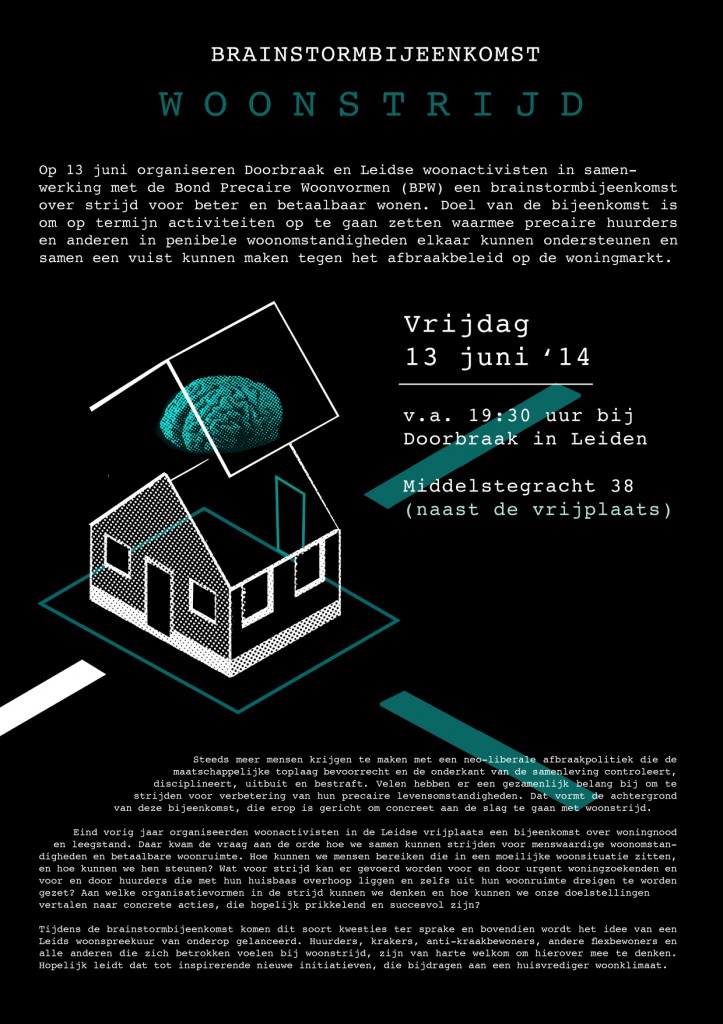 Op 13 juni organiseren Doorbraak en Leidse woonactivisten in samenwerking met de Bond Precaire Woonvormen (BPW) een brainstormbijeenkomst over strijd voor beter en betaalbaar wonen. Doel van de bijeenkomst is om op termijn activiteiten te gaan opzetten waarmee precaire huurders en anderen in penibele woonomstandigheden elkaar kunnen ondersteunen en samen een vuist kunnen maken tegen het afbraakbeleid op de woningmarkt.