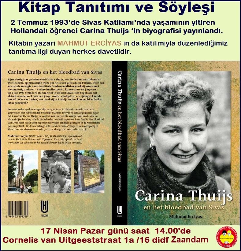 Op 17 april vindt in Zaandam een presentatie plaats van het onlangs verschenen boek “Carina Thuijs en het bloedbad van Sivas”, geschreven door Mahmut Erciyas en uitgegeven door uitgeverij Hermans. In deze biografie wordt het leven beschreven van een Nederlandse studente, afkomstig uit Doetinchem, die in 1993 in Turkije samen met 34 Turkse intellectuelen, kunstenaars en jongeren werd vermoord door moslimfundamentalisten. Het boek kan tijdens de bijeenkomst, die wordt georganiseerd door DIDF Zaanstad, ter plekke worden aangeschaft.