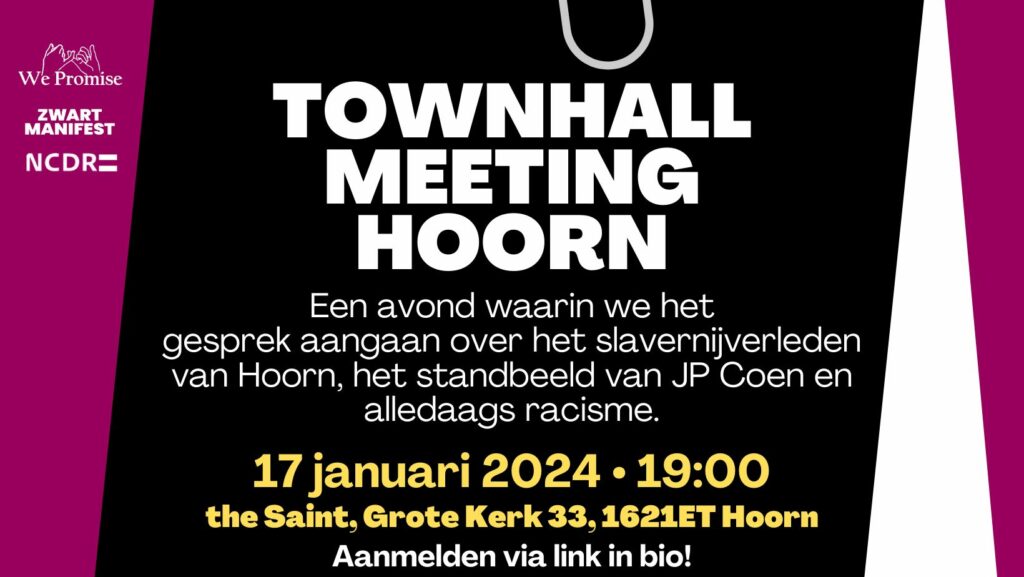 Op 17 januari organiseert de actiegroep We Promise in samenwerking met Zwart Manifest en de Nationaal Coördinator tegen Discriminatie en Racisme (NCDR) een “townhall meeting” in Hoorn. Deze bijeenkomst hangt samen met de strijd voor dekolonisering in deze stad, naar aanleiding van een onderzoeksrapport over het slavernijverleden van Hoorn. We Promise heeft het initiatief genomen tot de oprichting van de Werkgroep Slavernijverleden Hoorn, waar ook Doorbraak-activisten aan meedoen.