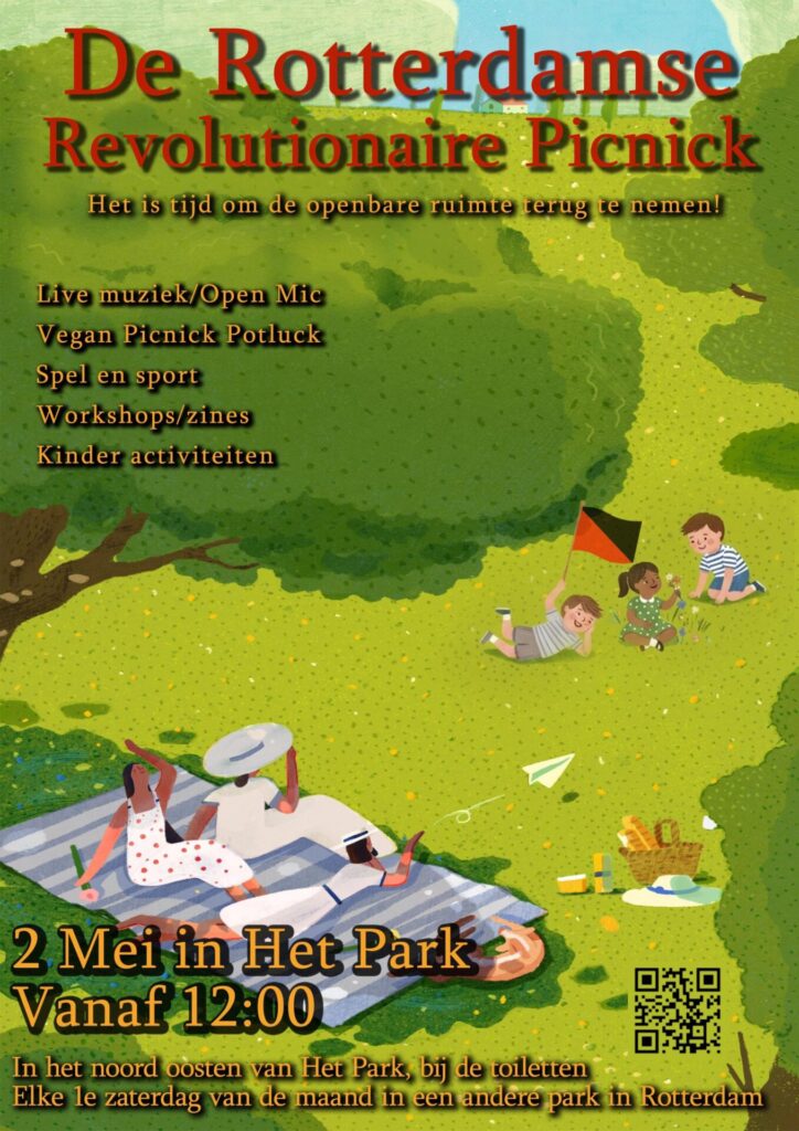 “🧺🌴⚽De Rotterdamse Revolutionaire Picnic begint op 2 mei om 12:00! Met een open mic, een (vegan) potluck, spelletjes, zines en kinderactiviteiten. We willen opnieuw met elkaar verbinden om een sterkere gemeenschap op te bouwen! We verzamelen in Het Park, aan de noordoostkant bij de toiletten. Neem vooral iets leuks mee, zoals eten, een stoel of een spel!