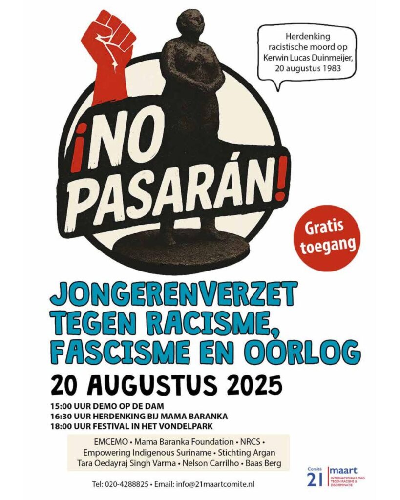 In het kader van de herdenking van de racistische moord op Kerwin Duinmeijer 42 jaar geleden organiseren het Comité 21 Maart en anderen op 20 augustus een aantal activiteiten in Amsterdam. Vanaf 15:00 uur vindt er een demonstratie plaats die vertrekt vanaf de Dam. Daarna is er een herdenking van de moord bij het standbeeld Mama Baranka in het Vondelpark. Vanaf 18:00 uur gaat op die plek vervolgens het “protestival” ¡No Pasarán! van start. Bij de herdenkingsactiviteiten hoort een oproeptekst die ook Doorbraak heeft ondertekend.
