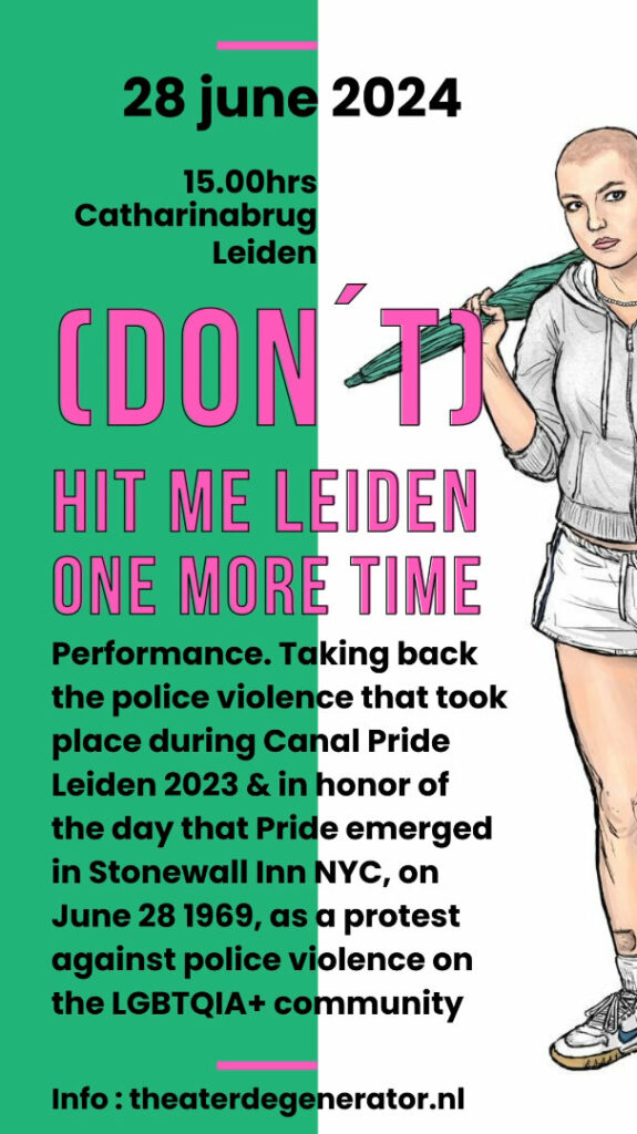 “Op 2 september 2023 werden er tijdens de Canal Pride in Leiden jonge leden van de lhbtqia+ community hardhandig tegengehouden om een protestbanner op te hangen aan de Catharinabrug. Ze werden geslagen, weggedreven naar een door de politie omsingelde plek en daar tegen hun wil vastgezet. Twee trans mensen werden met veel geweld gearresteerd, zonder aanleiding hiertoe. Dit alles op verzoek van de burgemeester van Leiden. Dit voorval is vrijwel stilgehouden en Leiden sprak enkel met trots over dit event, zo wonnen de organisatoren zelfs een Ondernemend Talent van het Jaar Award. Zowel de burgemeester als de organisatoren van de Canal Pride hebben geen publiekelijke afstand genomen van dit geweld.