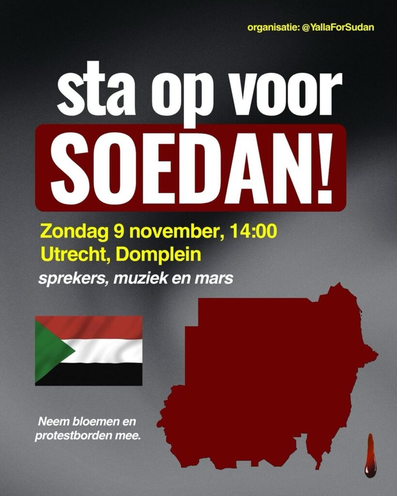 Op 9 november organiseert Yalla For Sudan in Utrecht een demonstratie tegen de voortgaande oorlog en genocide in Soedan. In 2023 brak er in dat land een oorlog uit tussen twee militaire fracties, de Rapid Support Forces (RSF) en de Sudanese Armed Forces (SAF). De bevolking van Soedan is daarvan het slachtoffer, met onnoemelijk veel doden, gewonden, vermisten, vluchtelingen en ontheemden als gevolg. De RSF heeft de vluchtelingenkampen rondom de stad Al-Fashir in Noord-Darfur aangevallen en vele duizenden mensen vermoord, in die kampen en in de stad zelf. Bovenop de moorden en de verwoestingen komt nog de hongersnood die blijft aanhouden.