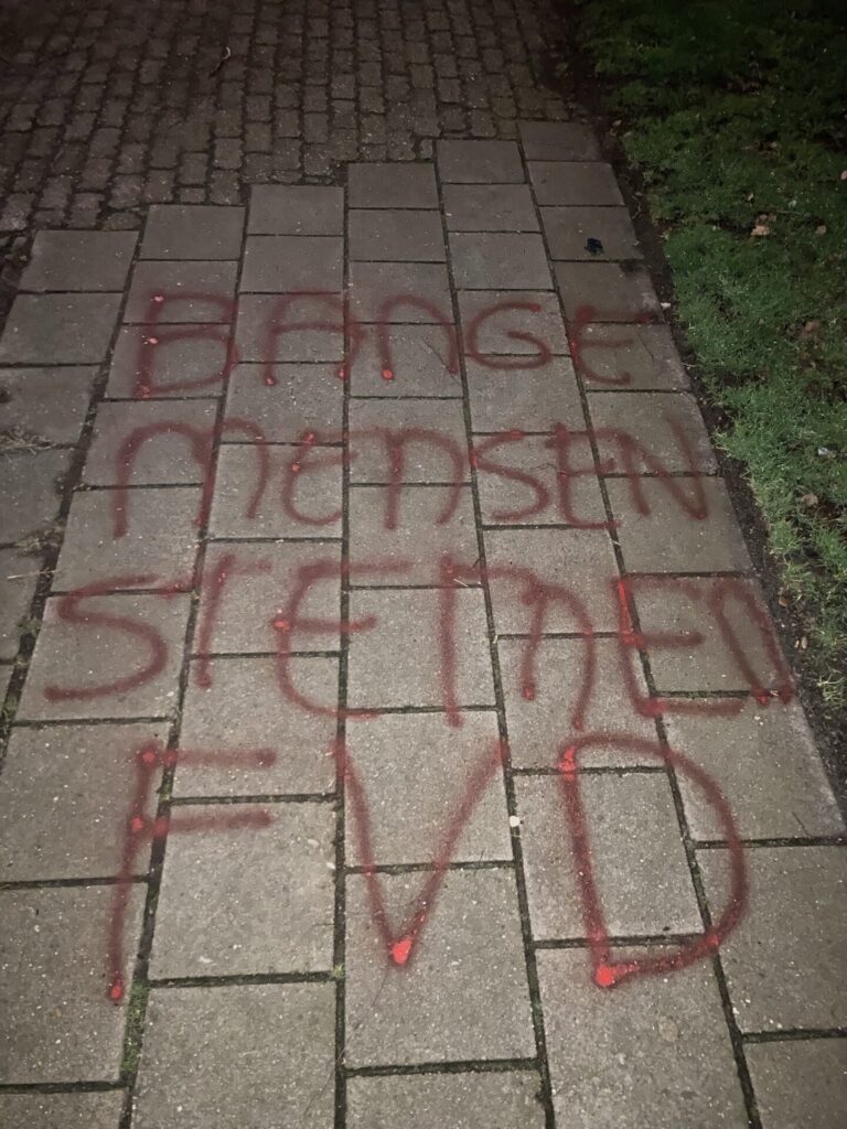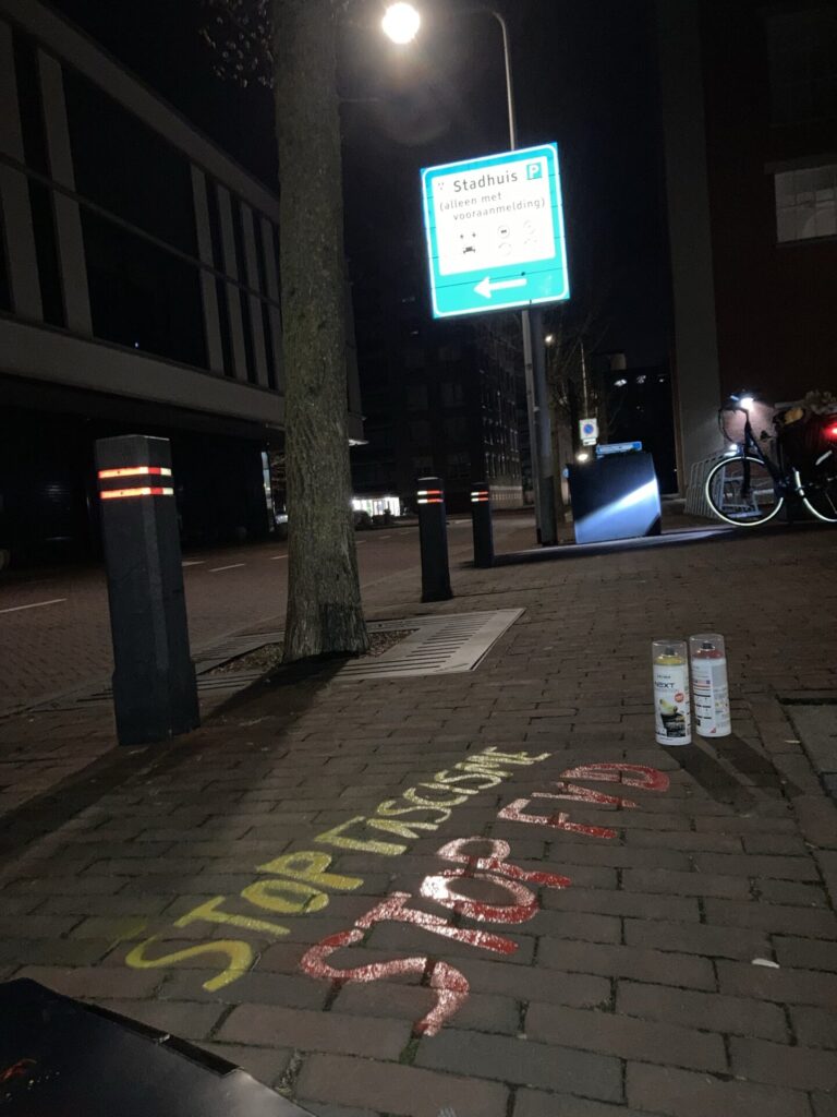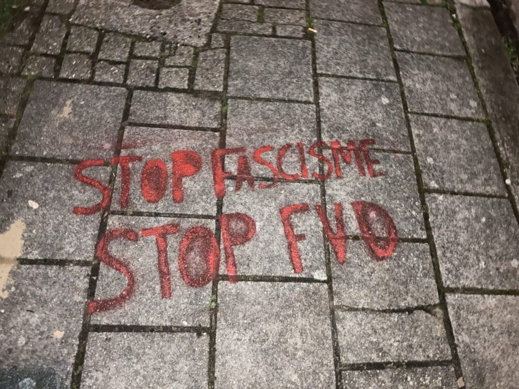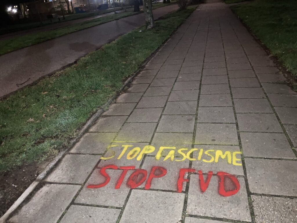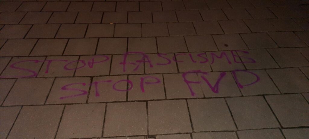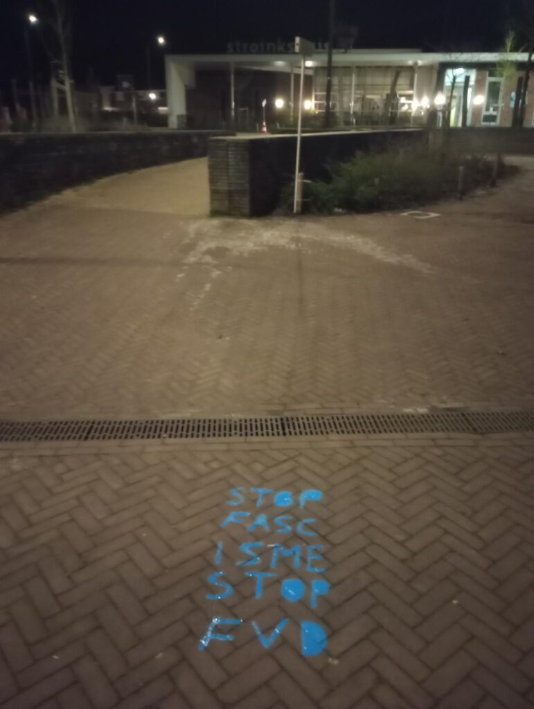 Doorbraak ontving vanochtend een aantal foto’s en dit persbericht: “Op meerdere locaties in Almelo en Enschede is met krijt de tekst ‘Stop fascisme, stop FvD’ op de stoep aangebracht. De actie is bedoeld om aandacht te vragen voor de manier waarop Forum voor Democratie (FvD) politiek bedrijft: een politiek die sterk leunt op het aanwakkeren van angst, wantrouwen en verdeeldheid. De retoriek van FvD vertoont kenmerken van fascisme, bijvoorbeeld het creëren van vijandbeelden en het benadrukken van een bedreigde nationale identiteit. Dit soort retoriek werd in het verleden gebruikt door bewegingen die autoritaire of anti-democratische tendensen ontwikkelden. Het wij-zij-denken, uitsluiting en angst voor ‘de ander’ zijn schadelijk voor een democratische samenleving. Politiek die burgers structureel wantrouwig maakt tegenover instituties, media en elkaar, zal de fundamenten van de rechtsstaat onder druk zetten. Echte problemen worden niet opgelost door groepen tegen elkaar op te zetten. Over de hele wereld zien we hoe autocratische leiders opkomen door angst te mobiliseren en mensen buiten te sluiten, dat willen we in Nederland voorkomen. Democratie vraagt om dialoog, vertrouwen en respect – niet om polarisatie en het verheerlijken van een geïdealiseerd verleden. Met deze actie hopen wij een maatschappelijk gesprek op gang te brengen over de gevaren van door angst gedreven politiek, opkomend fascisme en het belang van een democratische cultuur waarin wij allen als gelijkwaardige mensen tot elkaar kunnen komen.”