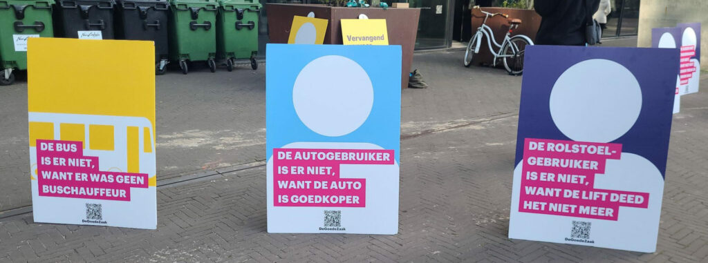 De tekst van een ander actiebord luidde: “De rolstoelgebruiker is er niet, want de lift deed het niet meer”. Een beter ov is namelijk juist ook noodzakelijk voor mensen met een beperking. Dat bleek uit de ervaringen van twee gehandicapte mensen die aan de actie deelnamen. Zij vertelden over de problemen die ze in het ov ondervonden. “We moeten niet doen alsof het thema fysieke toegankelijkheid alleen maar een beperkte groep mensen aangaat”, zei een van hen. “Iedereen kan gehandicapt raken. Als mensen ouder worden, dan neemt de kans op een handicap, een beperking, ook nog eens toe. Een handicap kan bijvoorbeeld al zijn dat je vaak hoofdpijn hebt. Als we het begrip ‘een handicap hebben’ veel breder gaan zien, dan wordt het alleen maar duidelijker dat de toegankelijkheid van het ov sterk moet worden verbeterd. Dat is in het belang van iedereen.”