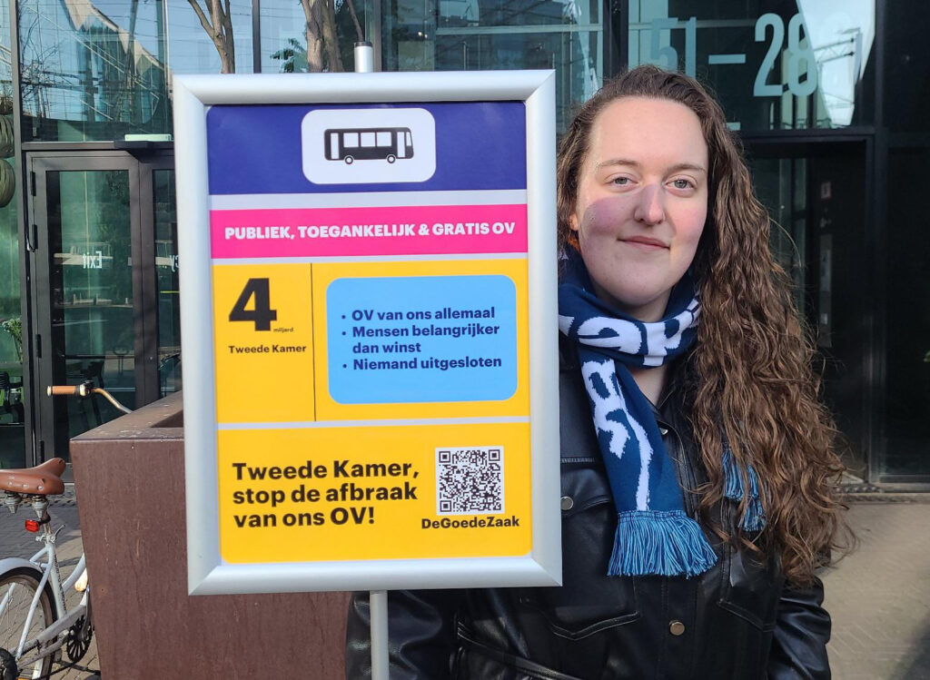 Vanmorgen vanaf 9:00 uur hebben zo’n vijftien mensen bij station Den Haag Centraal actie gevoerd voor een toegankelijk en gratis ov zonder marktwerking. De actie, georganiseerd door DeGoedeZaak (DGZ) en ondersteund door activisten van WijReizenSamen (WRS). werd gehouden in aanloop naar de behandeling van het burgerinitiatief van DGZ in de Tweede Kamer later op de dag. “Al jaren wordt ons openbaar vervoer buslijn voor buslijn gesloopt. Treinen worden drukker, kaartjes duurder en steeds meer regio’s worden onbereikbaar. Je kunt je afvragen of je het openbaar vervoer nog wel openbaar kunt noemen”, aldus DGZ. In de loop van de dag bleek helaas dat het burgerinitiatief werd afgeserveerd door een parlementaire meerderheid.