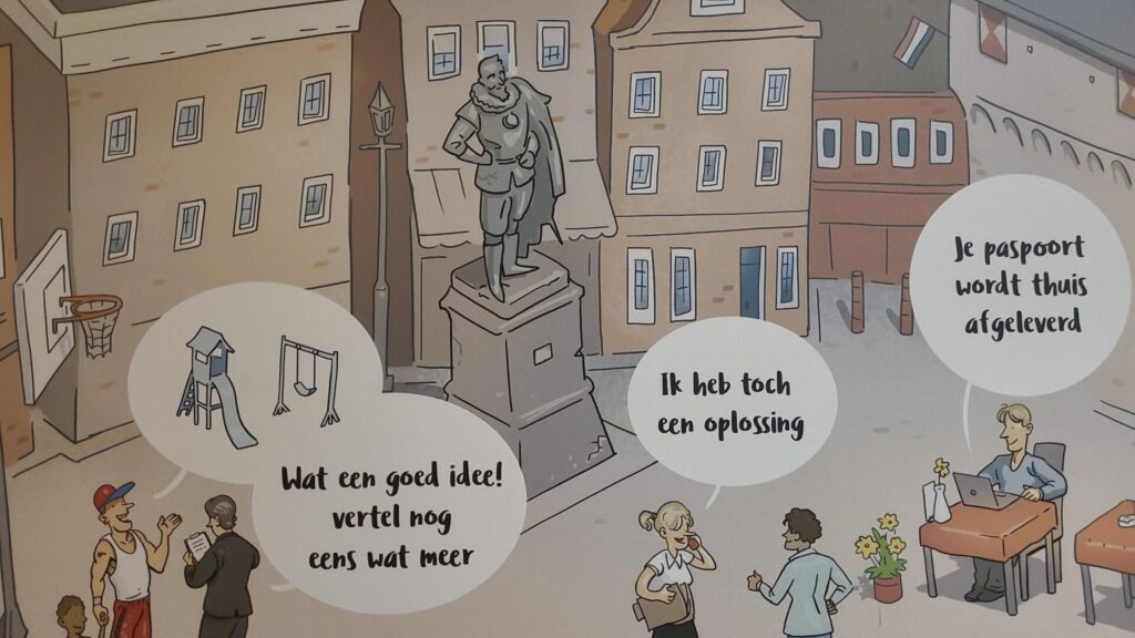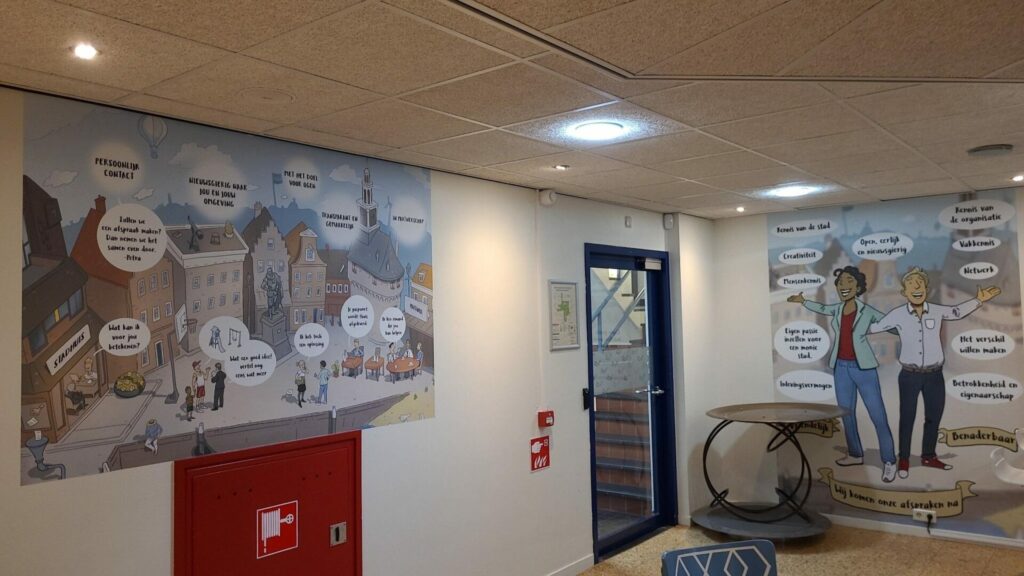 Bij binnenkomst in het stadhuis gisteravond werd eens te meer duidelijk hoe dekoloniale activisten zich in het hol van de leeuw wagen, als ze gaan inspreken bij een Hoornse raadsvergadering. Ze begeven zich dan in een vijandige omgeving vol witte onschuld, witte fragiliteit en witte superioriteitswaan. Niet alleen heeft een van de ruimten van het stadhuis de naam “Bontekoezaal” gekregen, genoemd naar de loopjongen van Coen die in opdracht van de VOC-gouverneur-generaal mensen tot slaaf moest maken en aan de dwangarbeid moest zetten. Ook hangt er aan de muur van de foyer van het stadhuis een grote propagandistische tekening waarmee de gemeente zich zelfgenoegzaam presenteert als sociaal, behulpzaam, ondernemend en vriendelijk, met het standbeeld van Coen als stralend middelpunt. Met andere woorden: het standbeeld van een massamoordenaar vormt voor de gemeente Hoorn het chauvinistische visitekaartje richting inwoners, toeristen, bedrijven en de rest van de samenleving.
