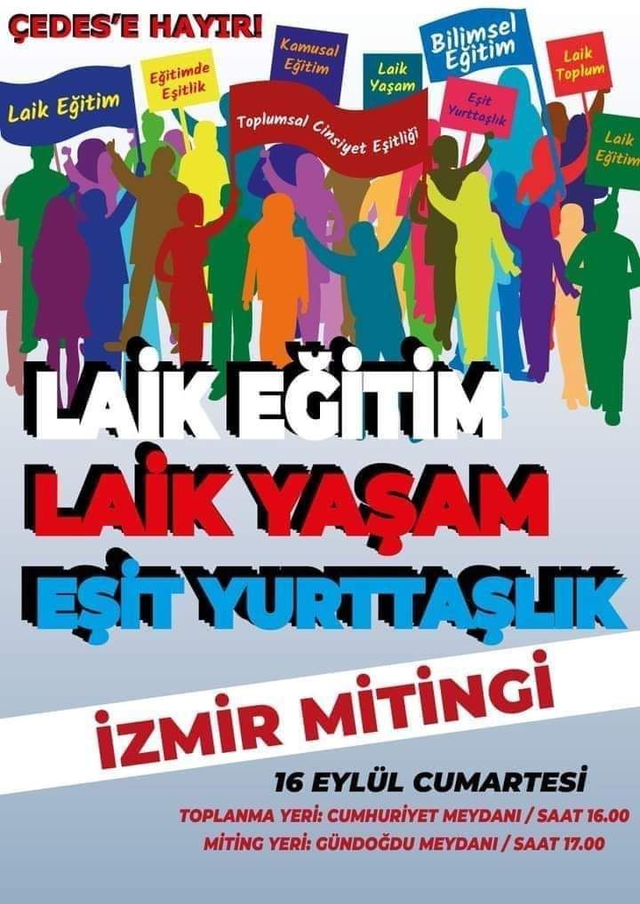Vakbonden, progressieve partijen en alevitische organisaties in Turkije zijn druk aan het mobiliseren voor een grote demonstratie in İzmir op 16 september. Zij roepen op tot “Seculier onderwijs, een seculier leven en gelijke burgerrechten”. De belangrijkste reden voor het protest is de intensivering van de samenwerking tussen Diyanet – de soennitische koepel van moskeeën – en het ministerie van Onderwijs. Op scholen worden in dit kader soennitische voorgangers aangesteld als “moreel adviseurs”.