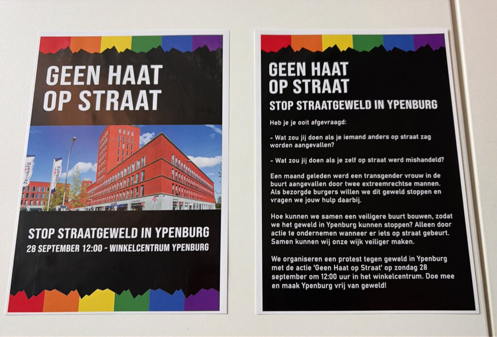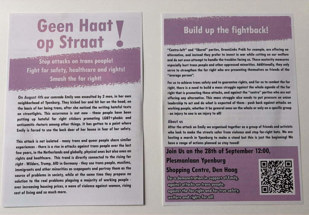 Afgelopen zondag vond in de Haagse wijk Ypenburg de demonstratie plaats tegen geweld tegen trans mensen. De actie naar aanleiding van het mishandelen van trans vrouw Emily was georganiseerd door de onlangs opgerichte groep Geen Haat Op Straat. Op een plein bij winkelcentrum Ypenburg was de vrijheidsdrang en het verlangen naar een rechtvaardige samenleving bijzonder voelbaar. Veel trans mensen en andere queers waren op de actie afgekomen, en dat leverde een kleurrijk, energiek en strijdbaar geheel op.