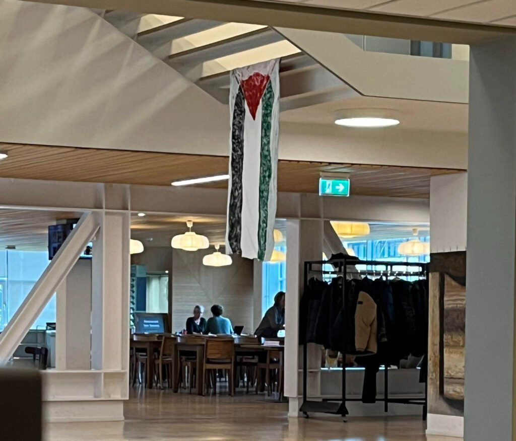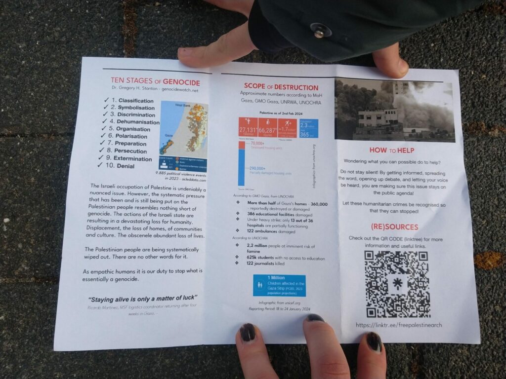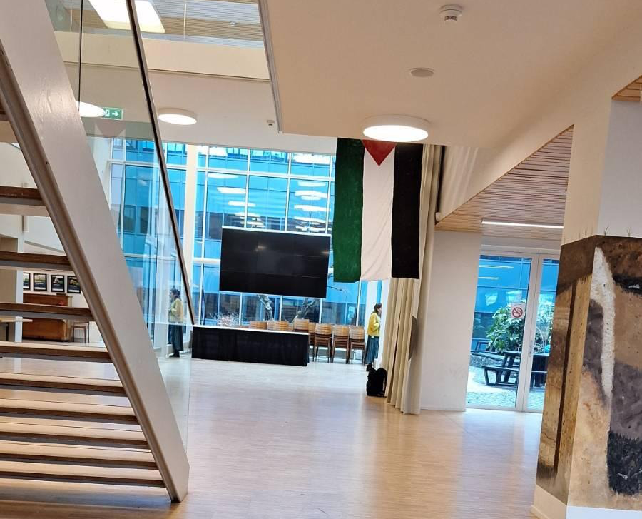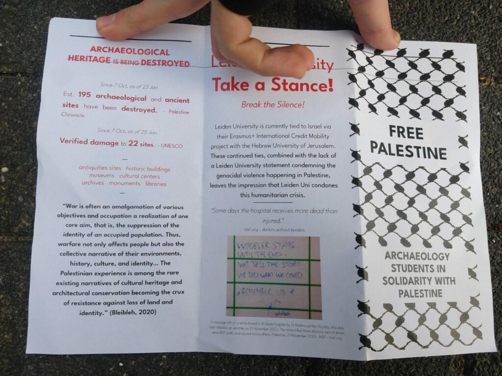 On Monday 5th of February 2024, a Palestinian flag was hung up in the Van Steenis building, Faculty of Archaeology of Leiden University. The flag was put up at 11am by a small group of students, and flyers with information about Gaza and Israel were distributed around the main halls, in order to put educational material and information out publicly for other students to look through and learn from. No sit-in or protest of any form was planned to take place.