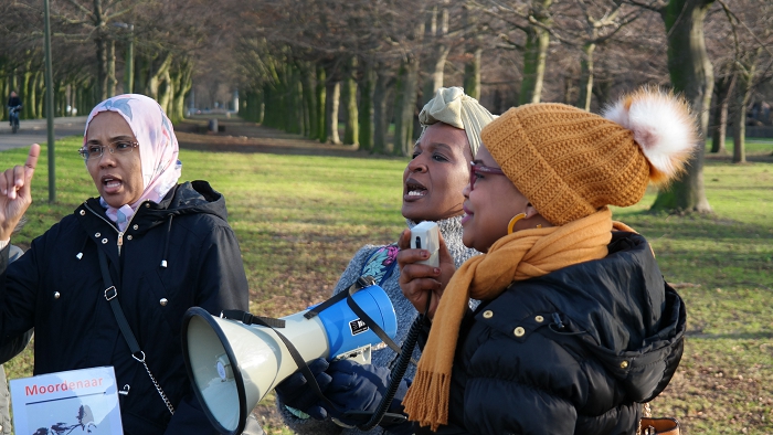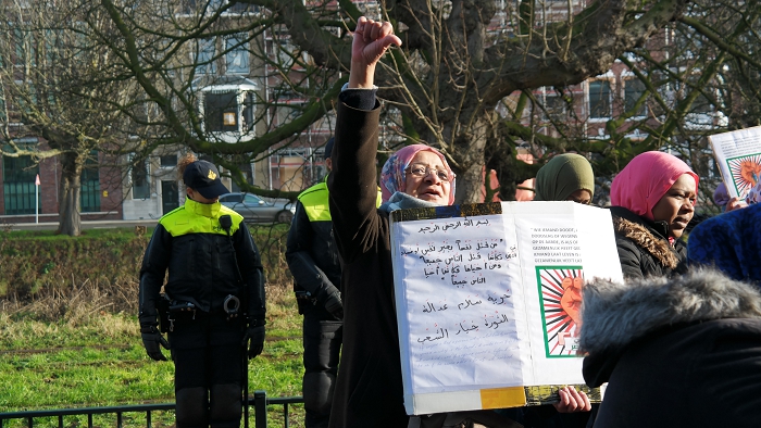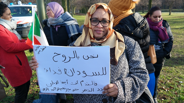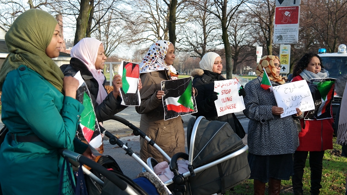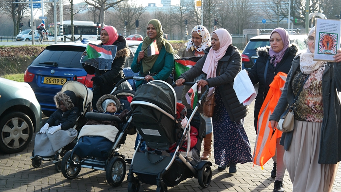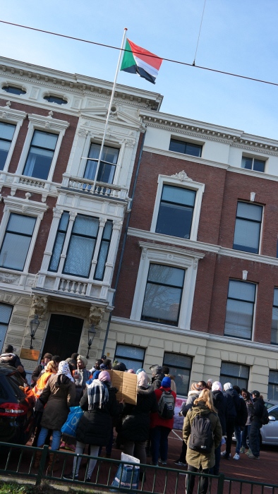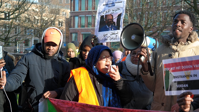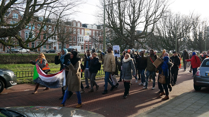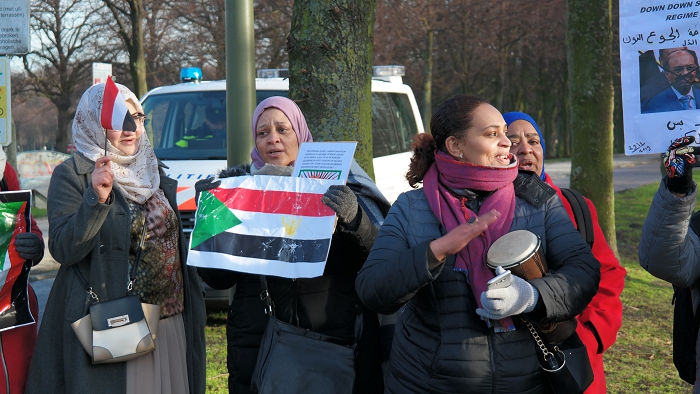 Vandaag protesteerden zo’n 40 Soedanezen en enkele sympathisanten in Den Haag tegen het regime van dictator Al-Bashir. Het protest was georganiseerd door de nieuwe Haagse vrouwengroep Kendakat, uit solidariteit met de opstand in Soedan. Zo’n 20 vrouwen verzamelden zich iets na tienen op het Malieveld, en draaiden daar warm door het voortdurende ritmische roepen van strijdbare leuzen. Dat deed de kou makkelijk vergeten. Na het arriveren van een groep uit Amsterdam vertrok de demonstratie naar de Soedanese ambassade aan de Koninginnegracht 64. Van de vijf busjes politie gingen er gelukkig uiteindelijk maar twee mee die richting uit. Bij de ambassade aangeland werden er twee korte toespraken gehouden, omlijst door het onophoudelijke en swingende roepen van leuzen richting dat bastion van de macht.