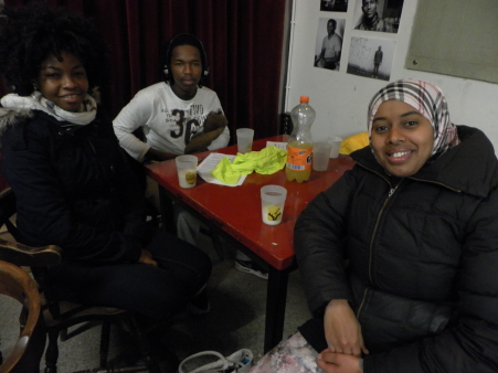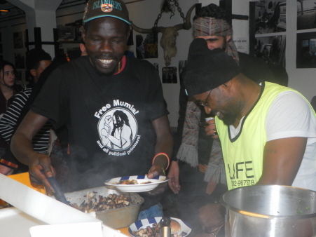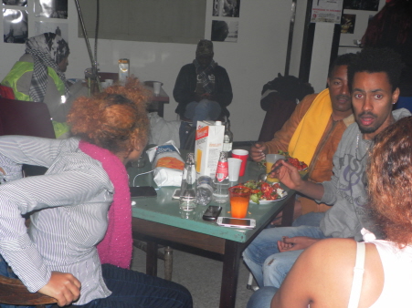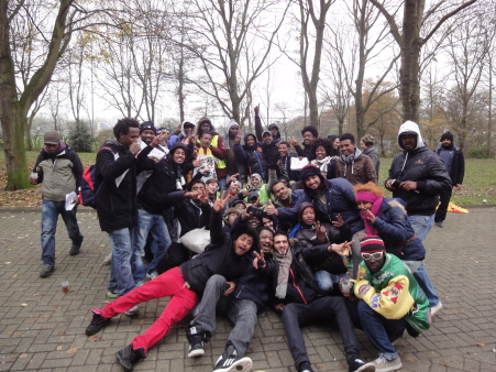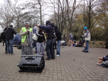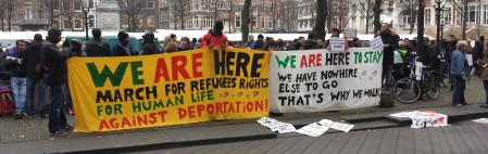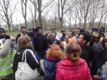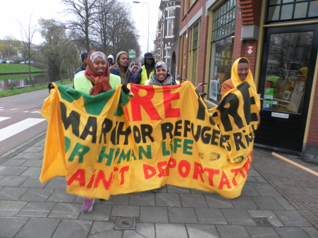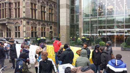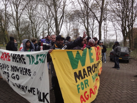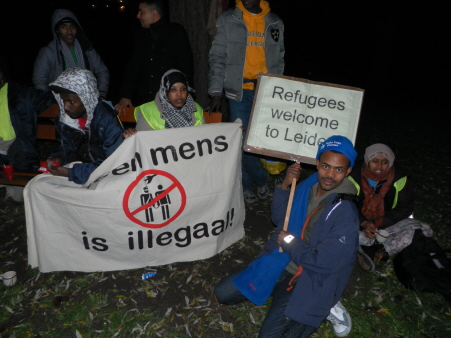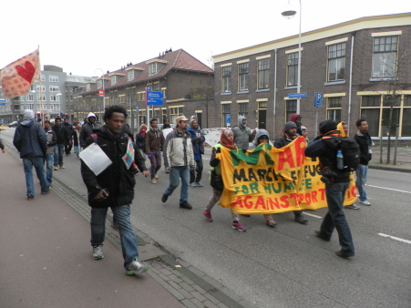 Ondertussen werd er op de Vrijplaats alweer gekookt door Le Sabot voor een maaltje bij de tussenstop halverwege Leiden en Den Haag. Ook daar werd nog wat gedanst, en ook geposeerd voor groepsfoto’s. Eenmaal op het Plein in Den Haag waren er ongeveer zestig mensen. De geluidsapparatuur moest van de politie uit, maar getrommeld werd er nog wel. Le Sabot was er ook weer met snacks en drankjes. Er werden leuzen geroepen als “We are dying in the streets”, “We want equal rights, we want justice” en veel van de andere leuzen die ze vandaag eerder ook al riepen. Een deel van de vluchtelingen ging naar binnen om het debat te volgen vanaf de publieke tribune. PVV-Kamerlid Sietse Fritsma zei daarover tijdens het debat dat illegalen van hem niet in de Tweede Kamer mochten komen. Er wordt al niet mét maar óver hen gepraat, en nu mogen ze van de rechts-populist ook nog eens niet horen wat er wordt gezegd. De vluchtelingen hoopten dat er na afloop nog parlementariërs naar buiten zouden komen met nieuws. Maar daarover later meer.