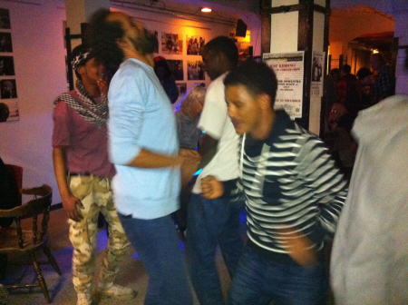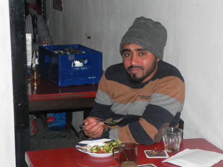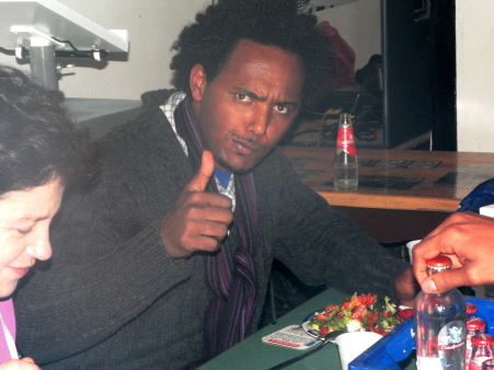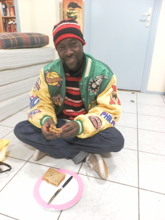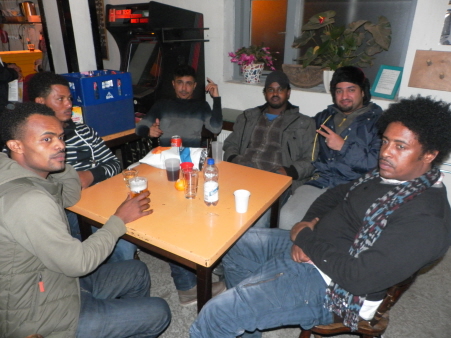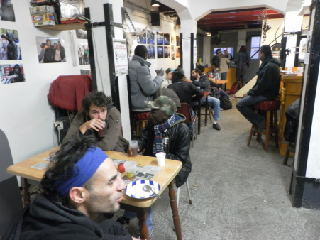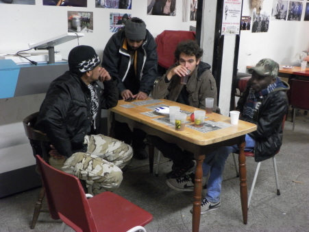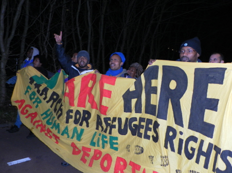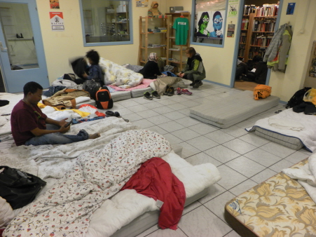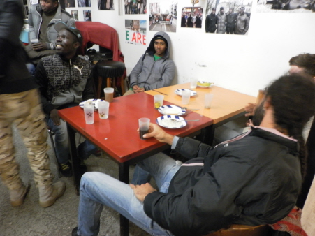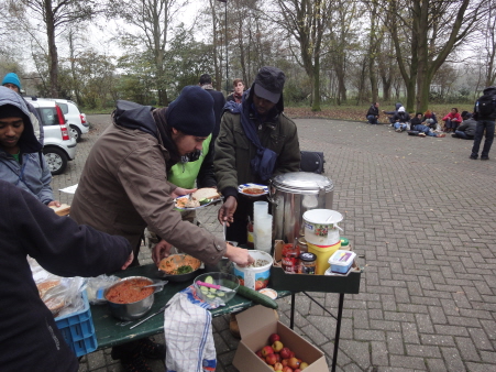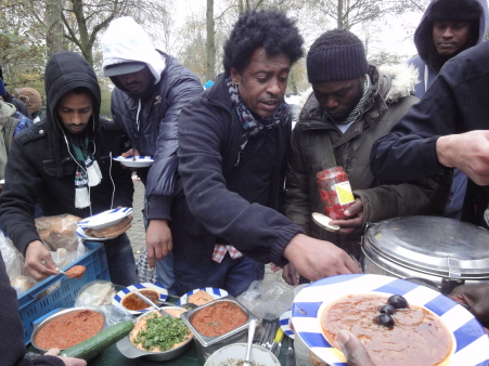 De warme maaltijd die Le Sabot daar voor hen had bereid, deed veel vluchtelingen goed, maar een flink aantal strompelde direct na het eten naar een douche en naar bed. Anderen maakten het nog behoorlijk laat in de Vrijplaats, waarbij er ook volop werd gedanst. De volgende ochtend ontbijt en weer op pad. Tijdens de strijdbare tocht werden voortdurend aanstekelijke leuzen geroepen als “O la la la, o le le le, solidarité avec les sans papiers”, “No more bla bla bla”, “We are here, we will fight, the freedom of movement is everybody’s right”, “Geen man, geen vrouw, geen mens is illegaal” en “The only solution is revolution”.