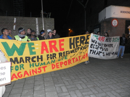 De ongeveer vijftig demonstranten die aan de mars meededen, werden rond zessen door activisten van Doorbraak verwelkomd aan de gemeentegrens met Warmond. Het bericht had ons al bereikt dat veel vluchtelingen blaren hadden en dat twee zelfs hun schoenen helemaal kapot hadden gelopen. Daarom hadden we nieuwe schoenen en blaarpleisters meegebracht. Na een warm drankje ging het swingend verder richting het kantoor van Doorbraak en de Leidse Vrijplaats.