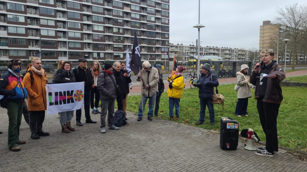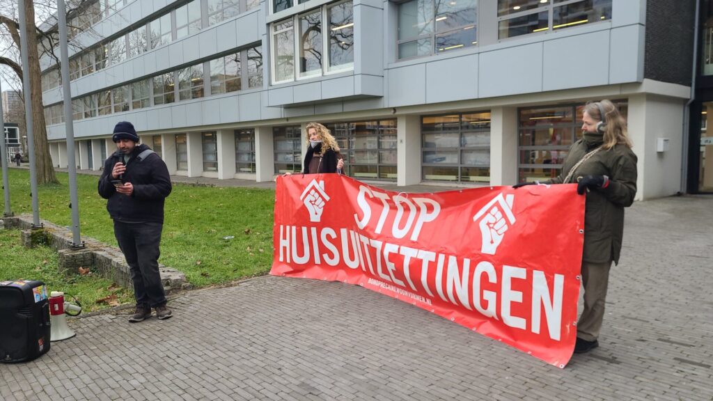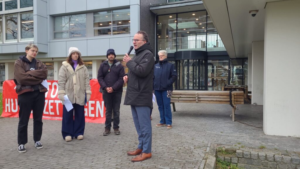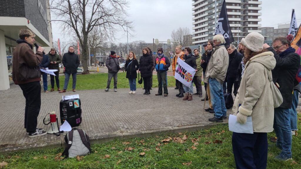 Na enkele korte toespraken volgde de overhandiging van de drie eisen van de Saffier-huurders aan vertegenwoordigers van Portaal: “1. Voorkom dakloosheid! Stop de uitzetting van 250 huurders op 26 maart. 2. Bied woonzekerheid! Zorg voor tijdelijke huisvesting tijdens de renovatie en laat bewoners terugkeren met een vast contract. 3. Stop het afschuiven van sociale verantwoordelijkheid door Portaal, de gemeente Utrecht en Socius op individuele huurders en de samenleving. Neem verantwoordelijkheid en waarborg woonzekerheid voor iedereen.”