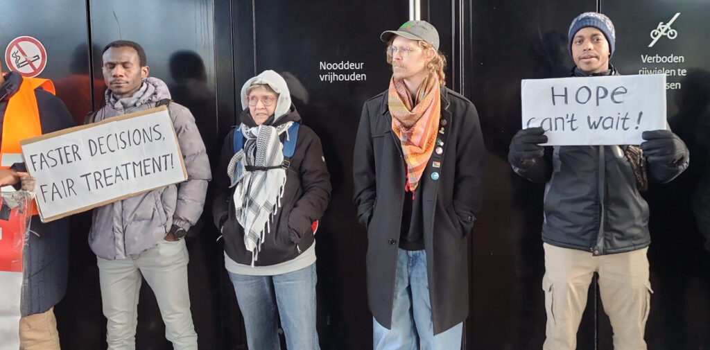 De actieborden bevatten teksten als “Justice delayed is justice denied”, “IND, hear our voice, reduce the waiting time”, “Faster decisions, fair treatment” en “Hope can’t wait”. En er vielen leuzen te horen als “Free, free, free Sudan” en “Peace, peace for Sudanese”. De vluchtelingen willen niet alleen dat de IND snel gaat beslissen op hun asielaanvraag, maar ook en vooral dat ze verblijfsrecht krijgen. Want hun leven loopt in hun land van herkomst gevaar en daarom eisen ze hier bescherming en veiligheid.