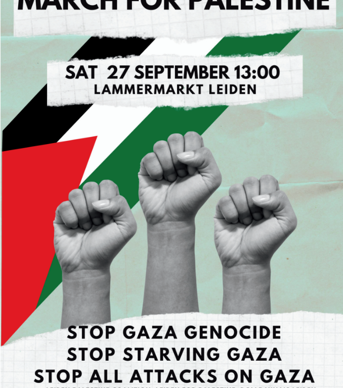 Op 27 september organiseert de Leiden Palestina Coalitie een demonstratie tegen de genocide in Gaza. De Leiden Palestina Coalitie bestaat uit de Palestijnse Gemeenschap In Nederland (PGNL), Leiden for Palestine, Dolle Mina’s Leiden, Leiden Scholars for Palestine, Dutch Scholars for Palestine, Nieuwe Vredesbeweging, BIJ1 Leiden, Partij voor de Dieren Leiden en SP Leiden. Sprekers tijdens de demonstratie: Omar Abdulaal namens