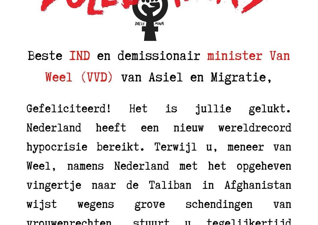 Enige tijd geleden stuurde Dolle Mina een woedende brandbrief naar de IND en demissionair minister Van Weel (VVD) van Asiel en Migratie. Terwijl Van Weel de Taliban in Afghanistan aanklaagt wegens schending van vrouwenrechten, laat hij tegelijkertijd gevluchte Afghaanse vrouwen deporteren naar dat moslimfundamentalistische regime. Als vervolg op de brandbrief organiseren de Dolle Mina’s op 10 december een protestactie bij