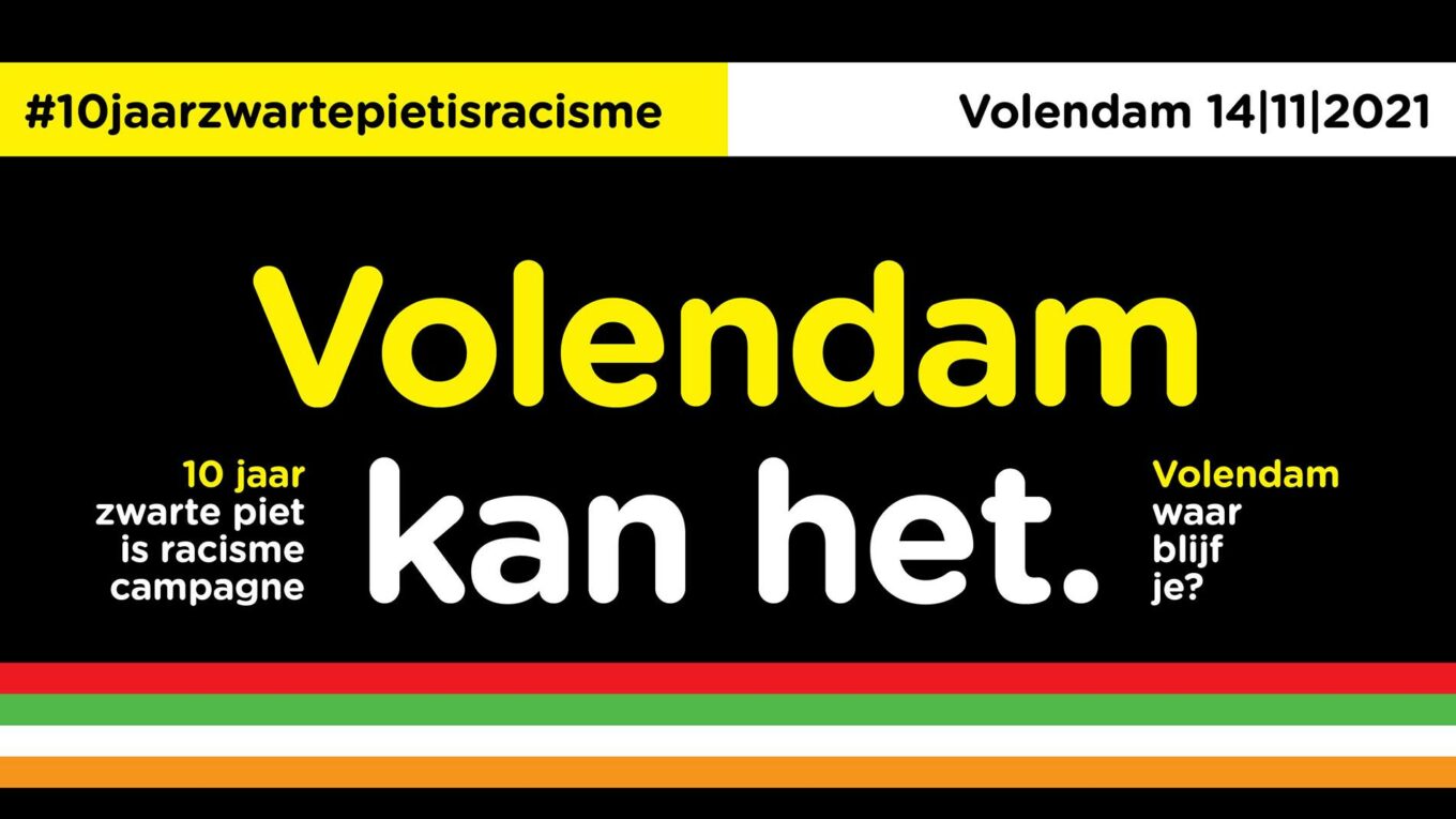 Op 14 november organiseert Volendam kan het in Volendam een demonstratie tegen de racistische karikatuur Zwarte Piet. Uit de oproeptekst: “Ieder kind en volwassene die in Nederland woont, heeft recht op een veilige en inclusieve samenleving. Dat is het standpunt van Kick Out Zwarte Piet (KOZP) en steeds meer Nederlanders: de laatste peilingen laten zien dat inmiddels de meerderheid van