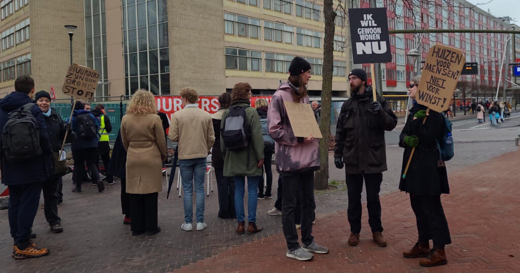 Zo’n dertig mensen deden gistermiddag in Leiden mee aan de actie die de Leidse afdeling van de Bond Precaire Woonvormen (BPW) had georganiseerd. De actie was gericht tegen de dreigende huisuitzettingen van de tijdelijke huurders die in de roodwitte Stationsflat wonen tegenover station Leiden Centraal. Met een al langer lopende campagne is de BPW Leiden bezig om druk op te bouwen tegen de verhuurder van de flat, Urban Interest, en zo de tijdelijke huurcontracten omgezet te krijgen naar vaste contracten.